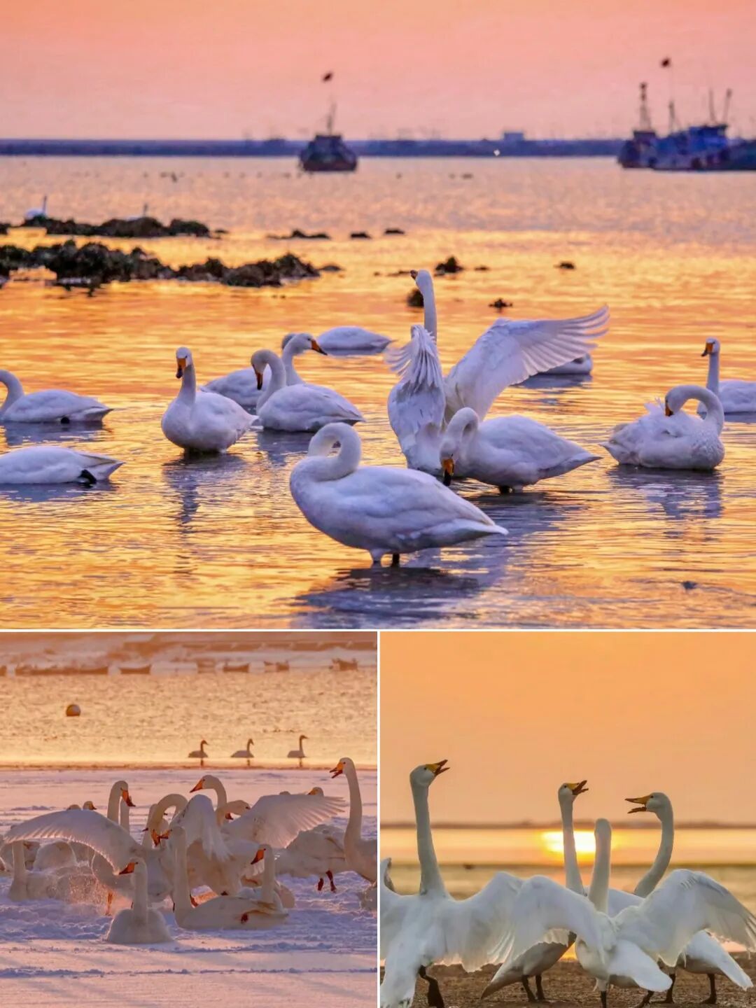 烟墩角万顷天海碧,一湾雪花白;渔船扬帆去,鸿鹄展翅来。这便是烟墩角所拥有的壮美景象。每年十月份以后,大批的天鹅迎着西伯利亚的冷空气逆风飞翔,不远千里万里,来到荣成过冬。