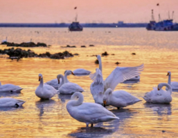 在海边与来自西伯利亚的天鹅近距离亲密,想喂天鹅的可提前准备玉米,海边也有卖的。这里是中国最大的天鹅湖,同时为世界上四大天鹅湖之一。天鹅、白雪,冬季的大海别有一番美丽。整个观天鹅海岸线约3公里,终点到花斑彩石参观,花斑彩石是五亿多年前寒武纪燕山期火山喷发的火山岩。
