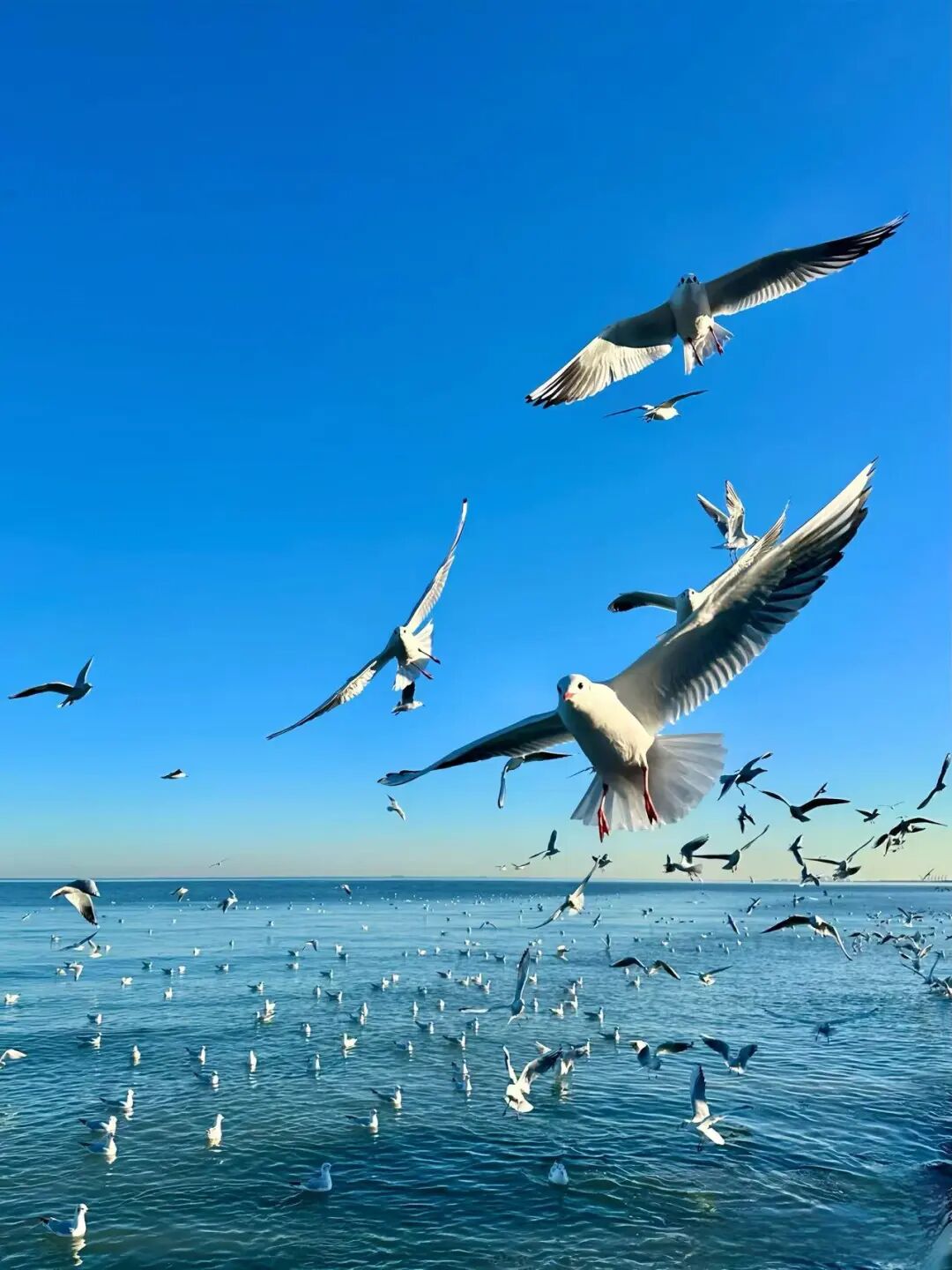 每年12月份开始从西伯利亚迁徙的红嘴鸥先后抵达天津 第一站便是东疆亲海公园 云集着翩翩起舞,让人不禁感慨“此景只应天上有” 以翱翔的海鸥为背景 拍出人与自然和谐相处的照片 生命力满满 这份来自大自然对人类的馈赠 您一定不能错过;