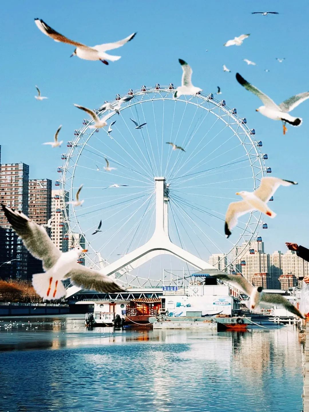 - 世界上唯一建在桥上的摩天轮『天津之眼』天津浪漫地标 年轻人打卡首选 ,以天津之眼为背景,盘旋河面的海鸥为主角,两者浑然天成,相映成趣,此时按下手中的快门,记录下这浪漫一刻!