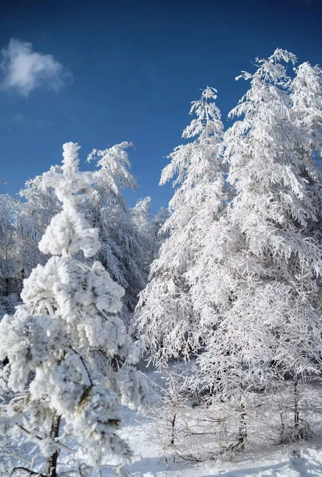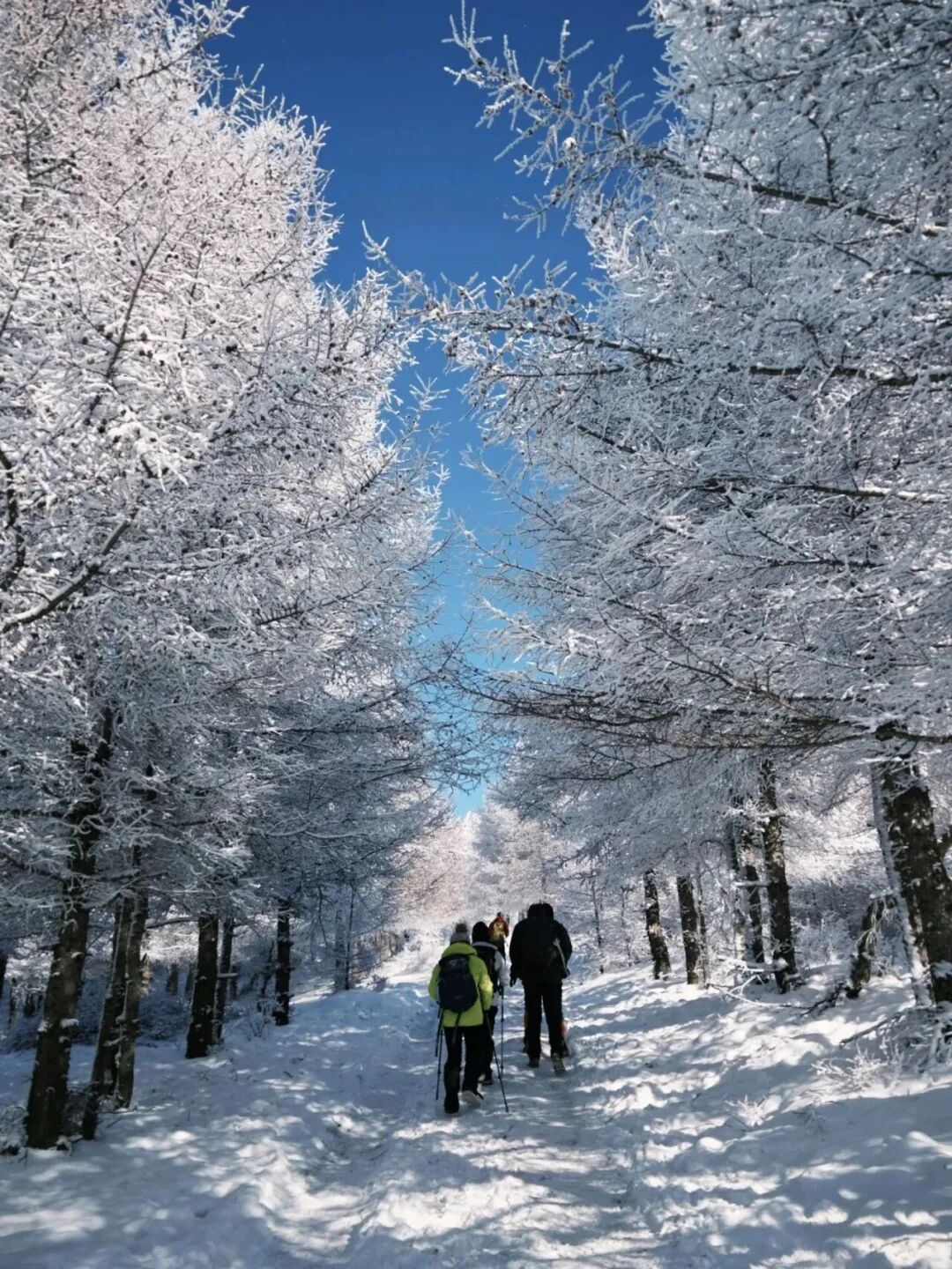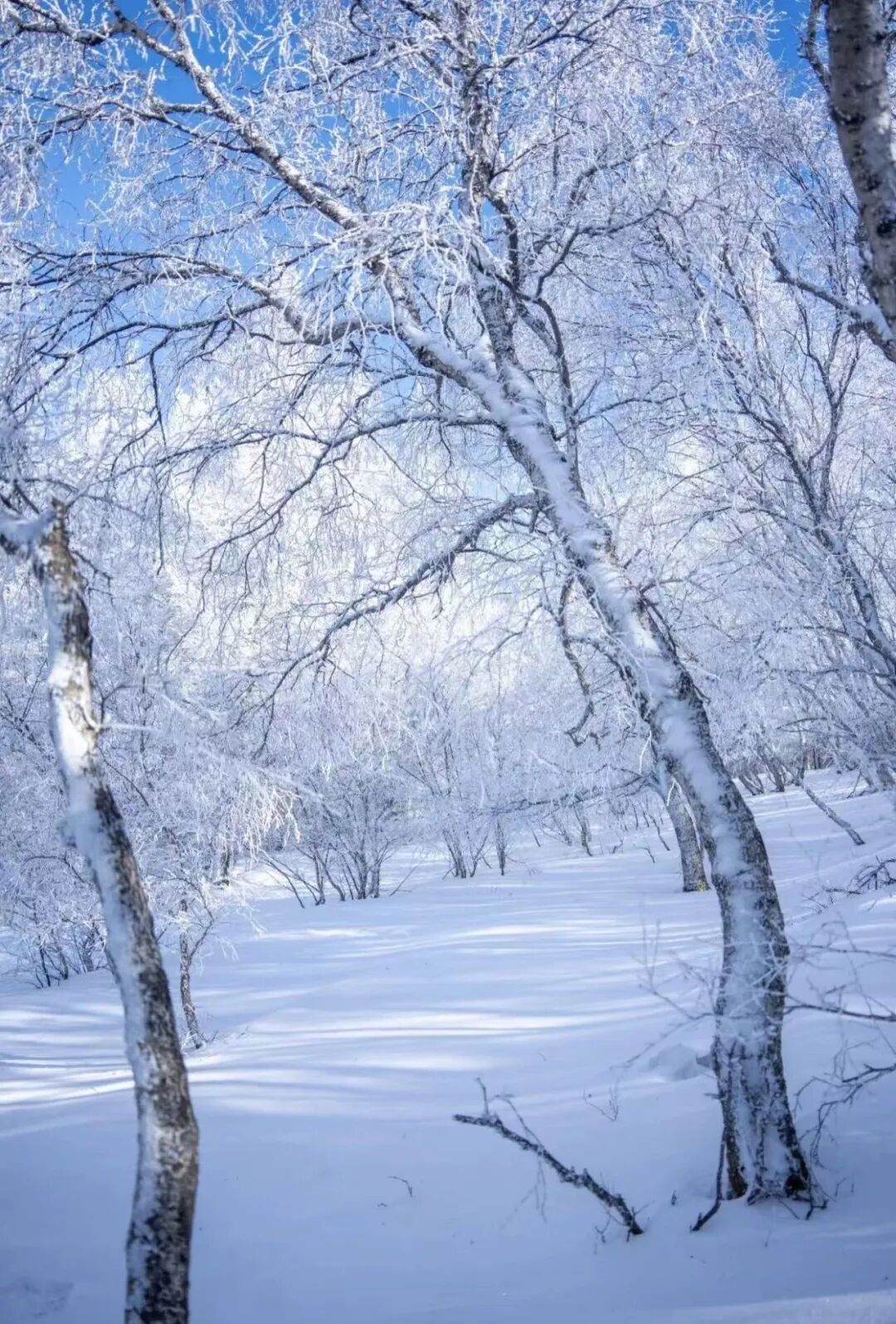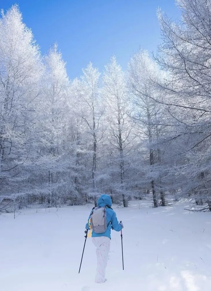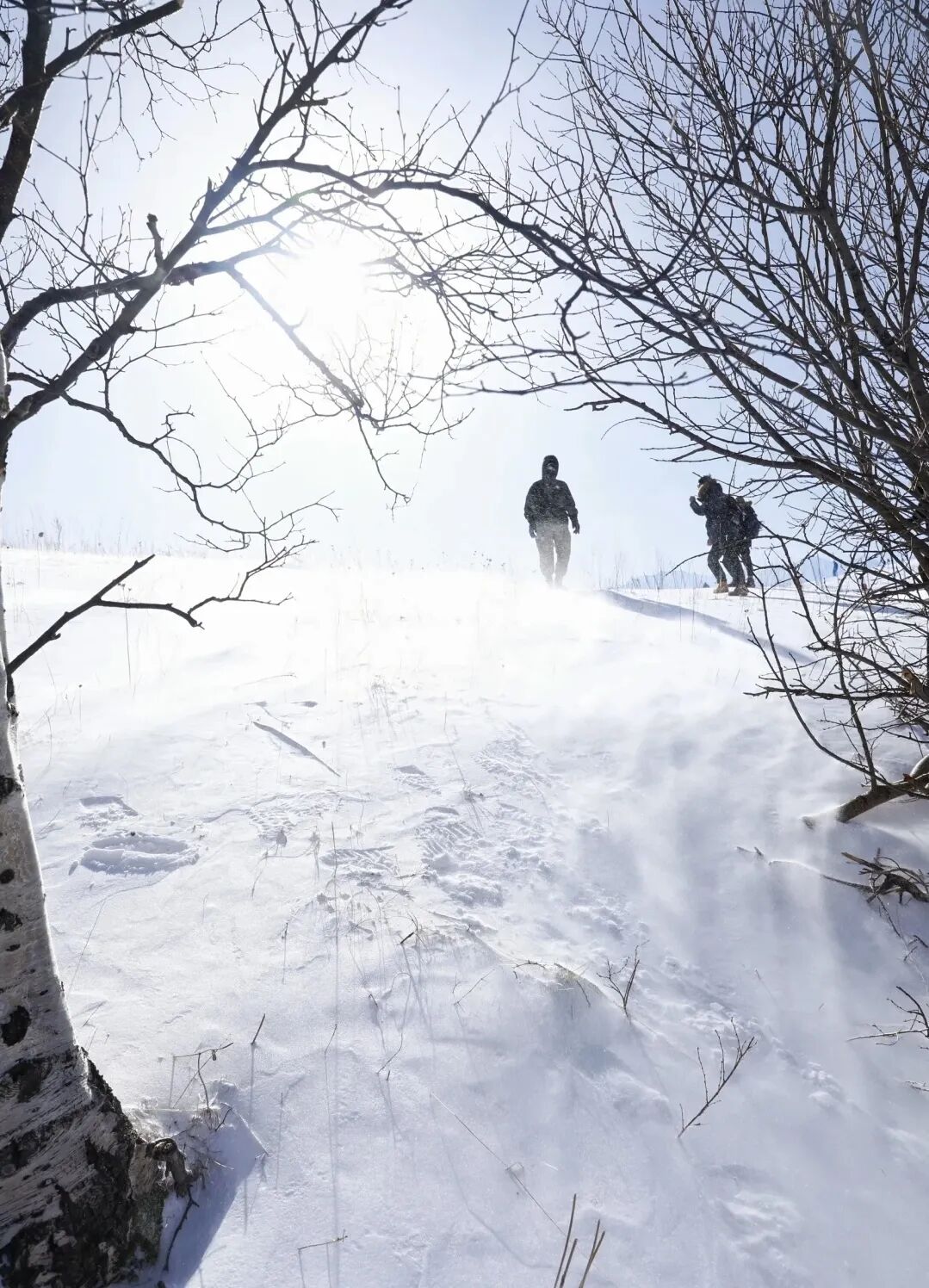 我们将向着这片 “雪域秘境” 进发。徒步途中,成片的桦树林褪去叶片,洁白的枝干在寒风中挺立,像是守护雪山的卫士;脚下的雪地松软而纯净,延伸向远方与蓝天相接,偶尔能看到野兔、松鼠的足迹,为这片寂静的雪原增添了几分生机。