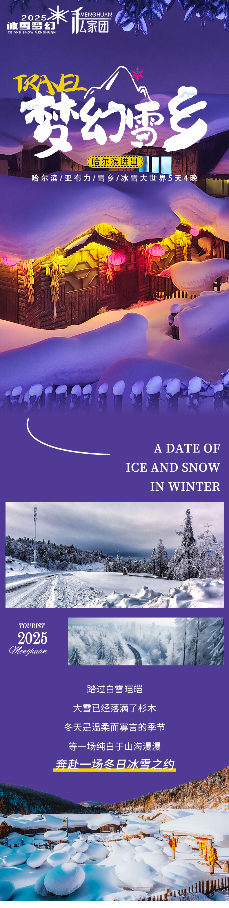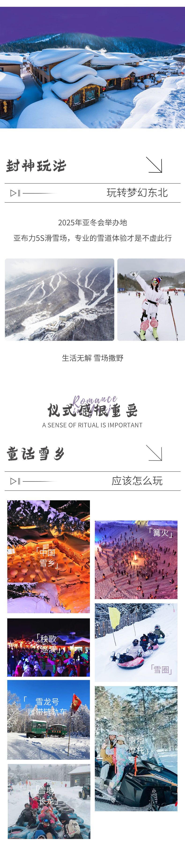 哈尔滨-冰雪画廊(300KM,车程约4小时)-雪地摩托-戏雪乐园-高山动物园-千人秧歌巡演-雪乡蹦野迪(16KM,车程约0.5小时)