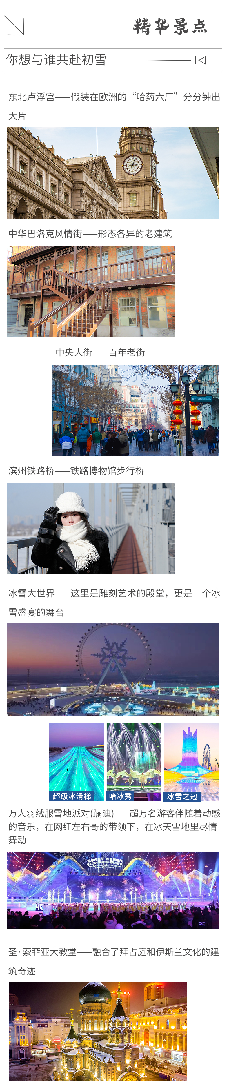 10:30 正式开启北国冰城之旅。游览火到霸屏的【哈药六厂】金碧辉煌堪称“东北卢浮宫”,漫步【中华巴洛克风情街】,行走在这里的数十条老弄堂里,随处可见建于20世纪初的巴洛克风格建筑,形态各异的老建筑,风格不同的建筑装饰,以及街头的民俗雕塑,勾勒成一道怀旧岁月的场景。想要了解这座城市的前世今生,怎么少得了百年【中央大街】, 全街汇集了文艺复兴、巴洛克及新艺术运动等多种风格,建筑是岁月的时钟,融入了这座城市古老的生活秩序,辗转不同的楼宇,感受独特的异国风情,老房子看得见风景,更看得见传奇。象征着和安宁的白鸽,环绕在【防洪纪念塔】周围,仿佛告诉先人如今的祥和,向人们诉说她存在的意义;始建于1900年的【滨州铁路桥】历经113年风霜完成了历史使命,改作铁路博物馆步行桥,钢筋铁骨重新粉刷灯光也在江上亮起,成为了新晋网红打卡地。【圣·索菲亚大教堂】是哈尔滨发给世界的邀请,来到这座浪漫之城,就千万不要错过这场唯美的约定。蜿蜒逶迤至遥远的拜占庭,清水红砖不知是多少人的近乡情怯,窿顶苍穹有萦绕着多少他乡思念,这里虽四季分明,但从来不缺热情。