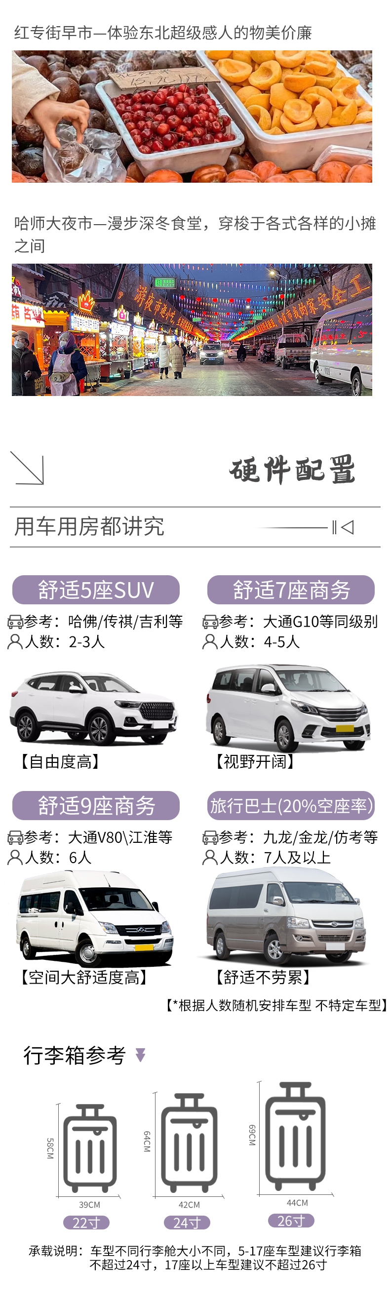4、门票:雪乡门票+往返环保车、冰雪大世界门票(未开放时间退门票328);