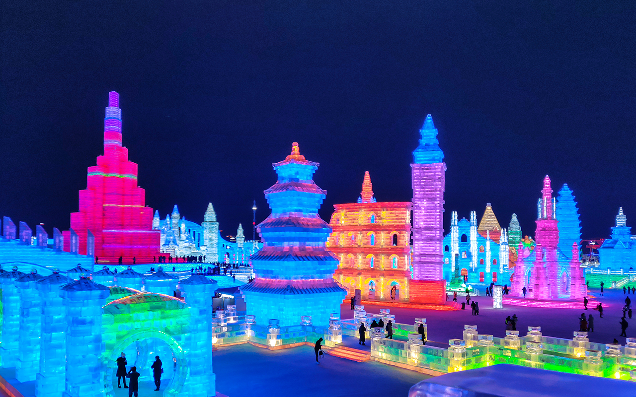17:00 【冰雪大世界】用冰雕刻出的世界仿佛置身于梦境,伸手触碰到的每一寸冰雪好像都有了生命,白天纯粹无暇,是一种风格,傍晚夕阳衬托,反射着金光,像冬日的寂静。晚上亮起糖果配色的灯光,冰雪景观流光溢彩、炫丽无比。