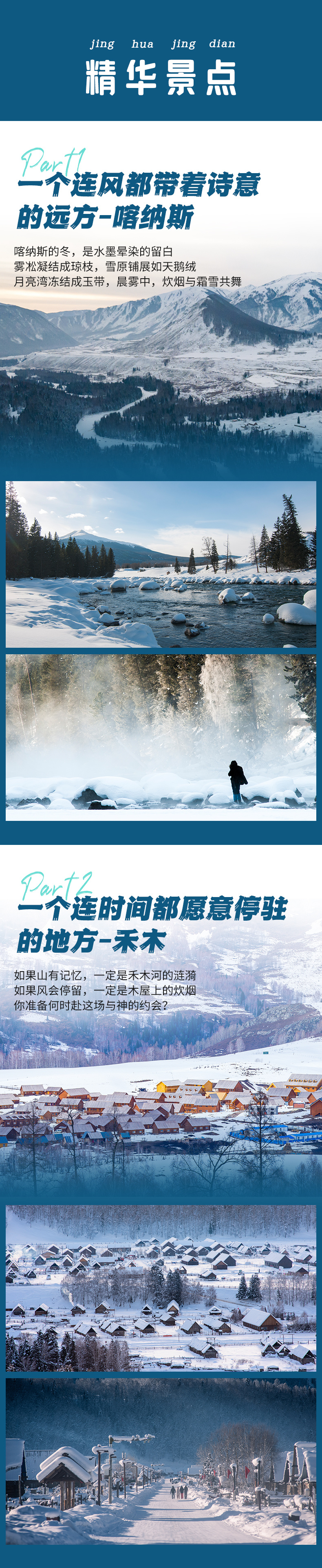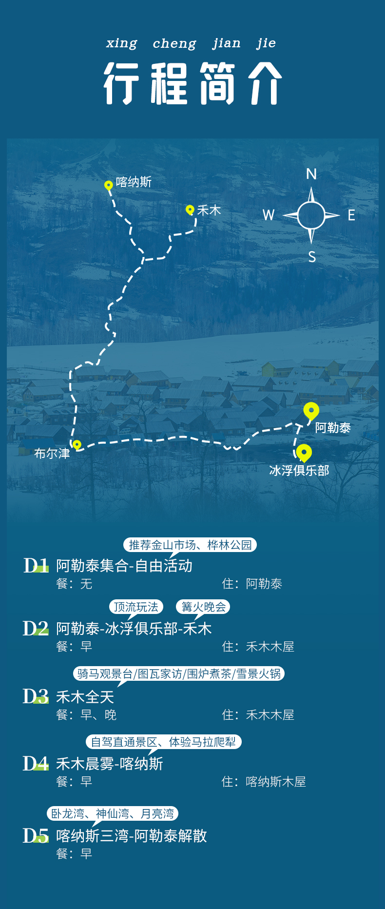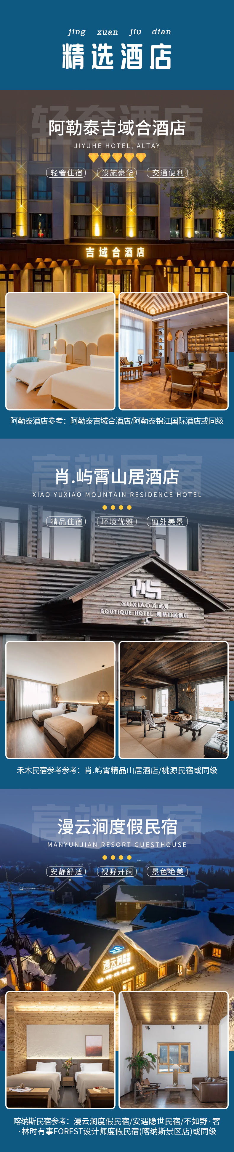 1、住宿:阿勒泰5钻酒店标间1晚,禾木木屋雪景标间2晚,喀纳斯雪景木屋标间1晚。
