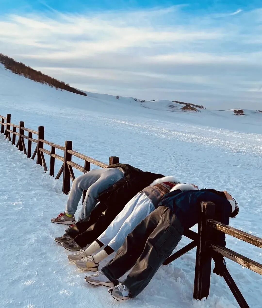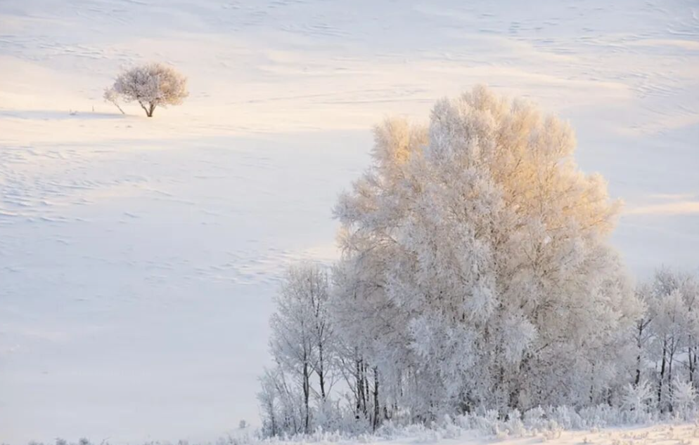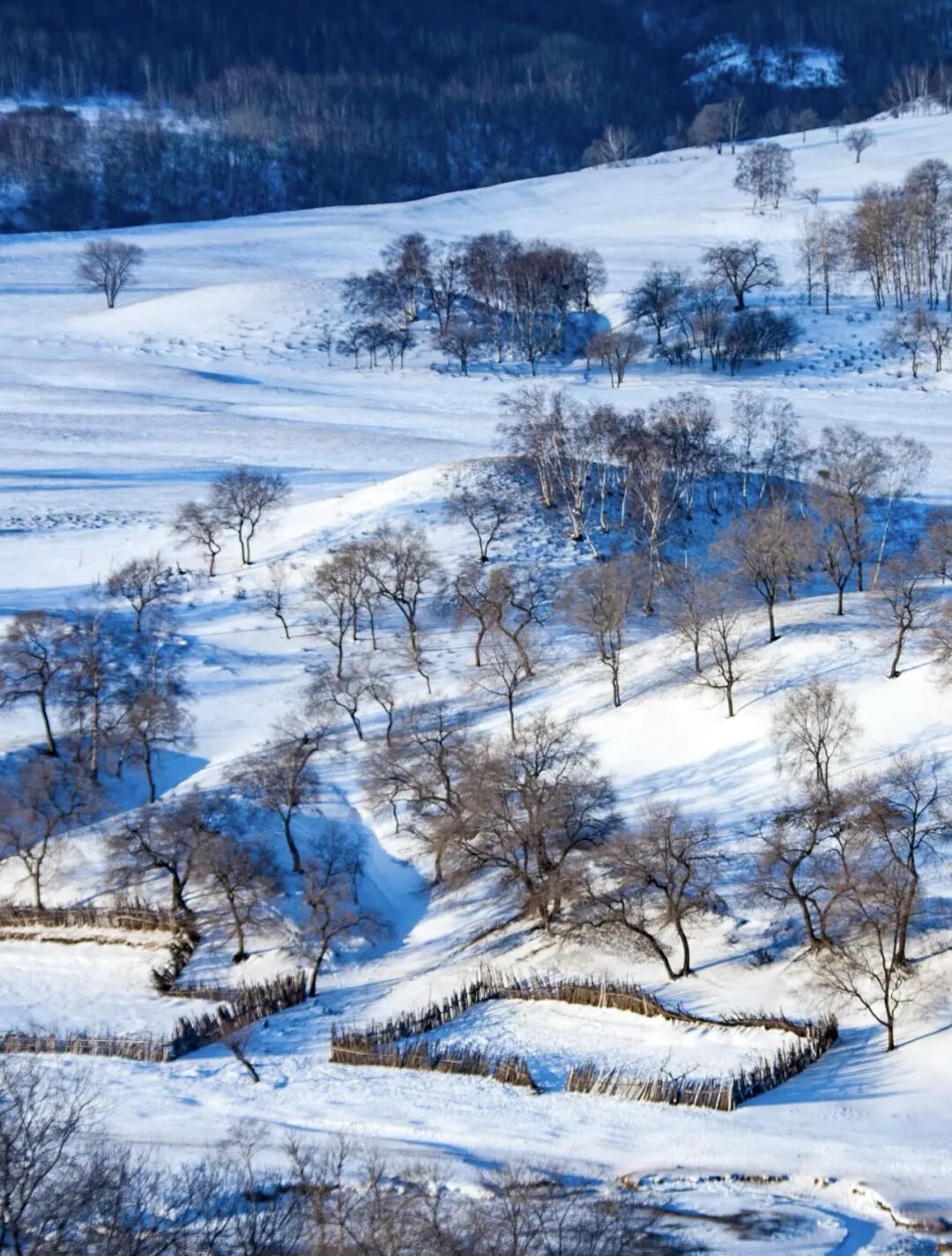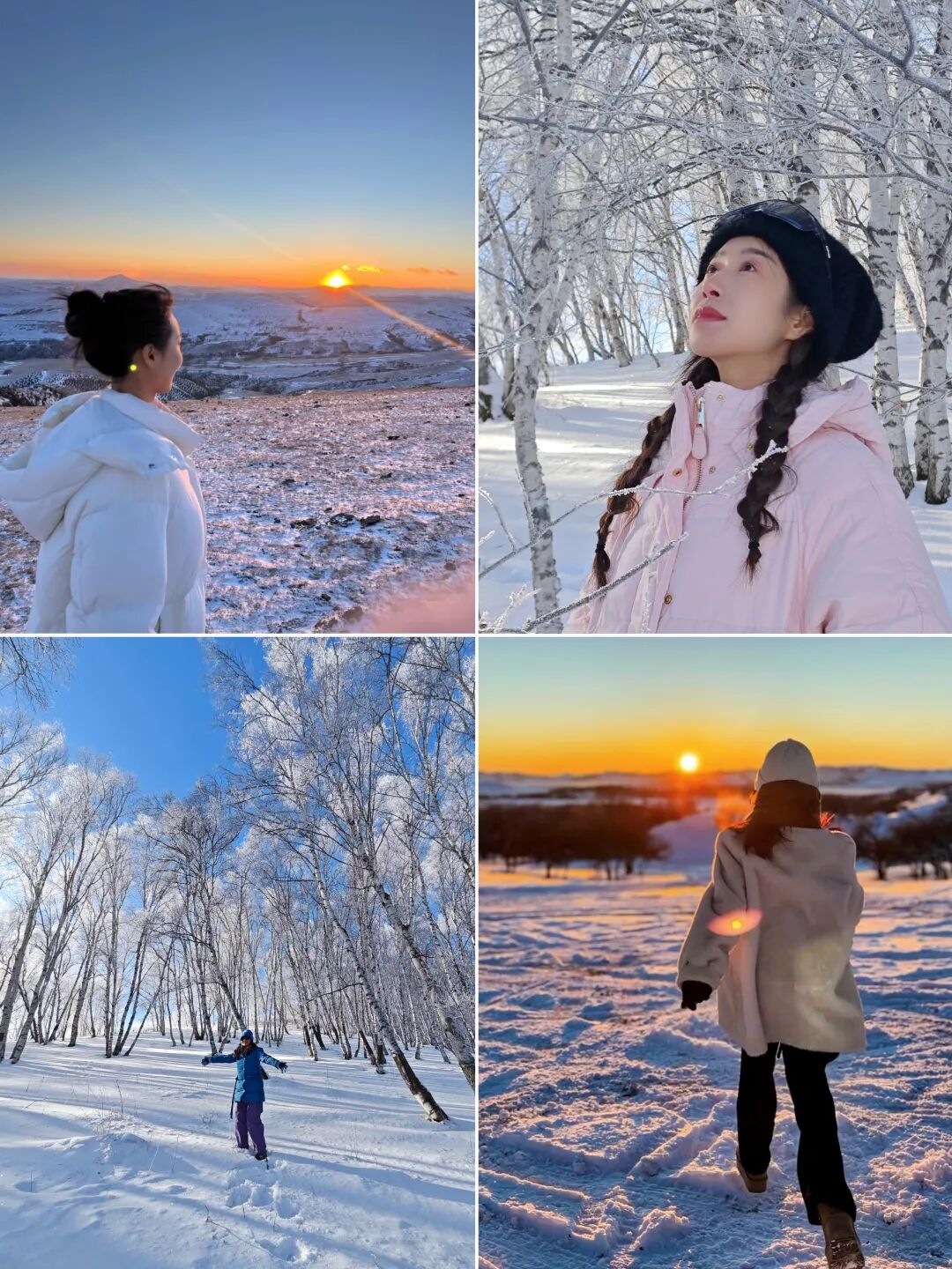 离开哈蟆坝后,前往塞北雪乡【白家窝铺】体验玩雪乐趣。这里的雪丘之上错落分布着白桦林,夕阳映照下,洁白树干与积雪相映成趣,修长的树影投射在雪丘间,层次格外分明。