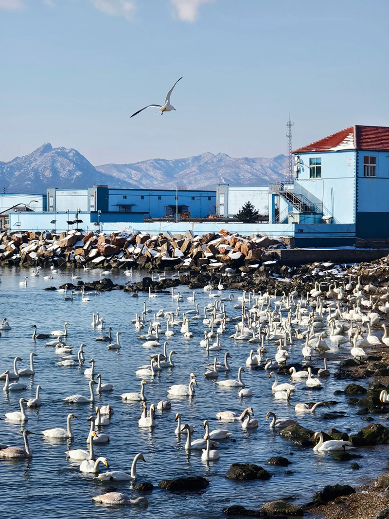 每年十月份以后,大批的天鹅迎着西伯利亚的冷空气逆风飞翔,不远千里万里,来到荣成过冬。成千上万只野生的大天鹅从遥远的西伯利亚、贝加尔湖、新疆和内蒙成群飞到荣成的海湾和湖泊栖息越冬。烟墩角天鹅湖就是其中之一,烟墩角也因此有了“天鹅村”的美誉。