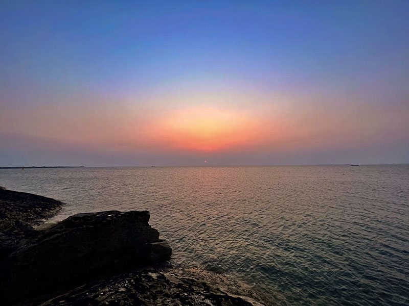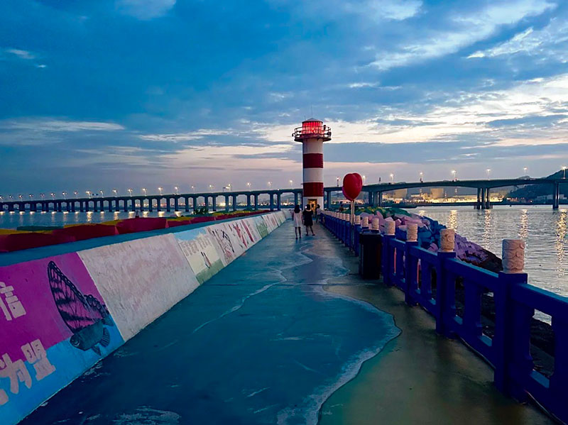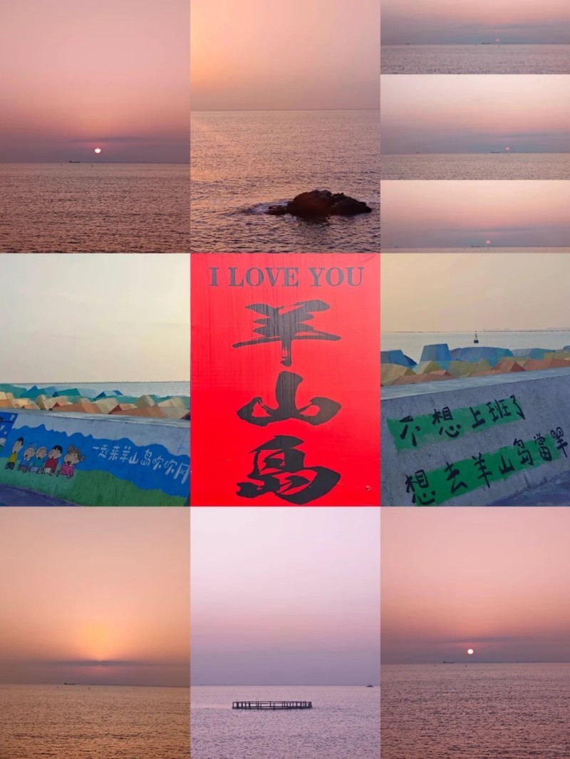 在这里可以参观羊山岛博物馆,展示了羊山岛地区的文化历史、风土人情、科普社教和产业资源,凸显羊山岛海洋地域特色。沿街拾阶而上,可以看到巨幅羲和浴日雕塑、羲和宫,霜降时节。顺着幽长的登山小径,漫步于松林之中,站在观桥台前抚栏凭眺,海天相间处一座大桥映入眼帘,宛如一条巨龙,卧波跨海,飞架南北。最后我们可以来到彩虹灯塔,在拦海大堤、护坡、栈道,绘制彩虹、沙滩、斑马线等元素丰富的文化墙,展示美丽海岛新形象。傍晚还欣赏这里醉美的日落!
