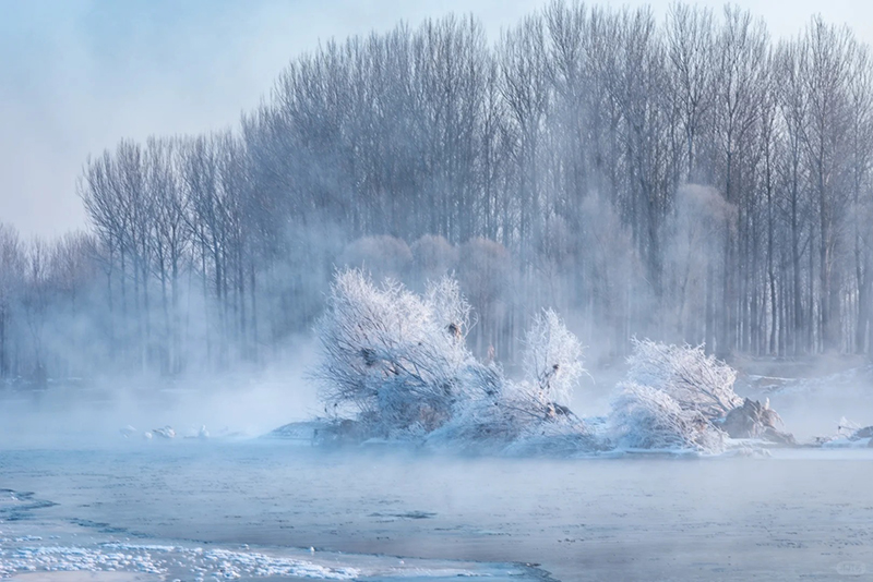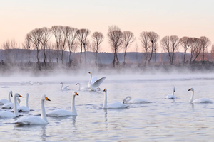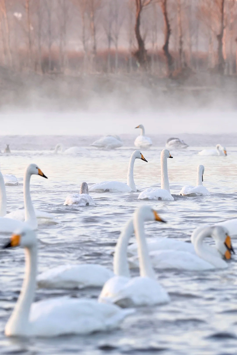 晨光熹微,镜面渐渐明亮,映出大树的倒影,水边的雾凇愈发清晰晶莹,河湾深处,隐约传出天籁般的鸣叫。晨晖氤氲江澄练,柔情绰态迷离眼。水翻倒影惊鸿艳,白羽仙姿凌波寒。微微晨曦中,一群白天鹅映入眼帘,如星星点点,似白莲盛开。