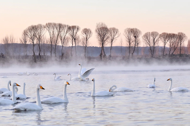 - 早起集合前往『杨柳湾天鹅湖』,这里的日出、天鹅、晨雾非常出片,运气好的话还能欣赏到这里绝美的雾凇美景!