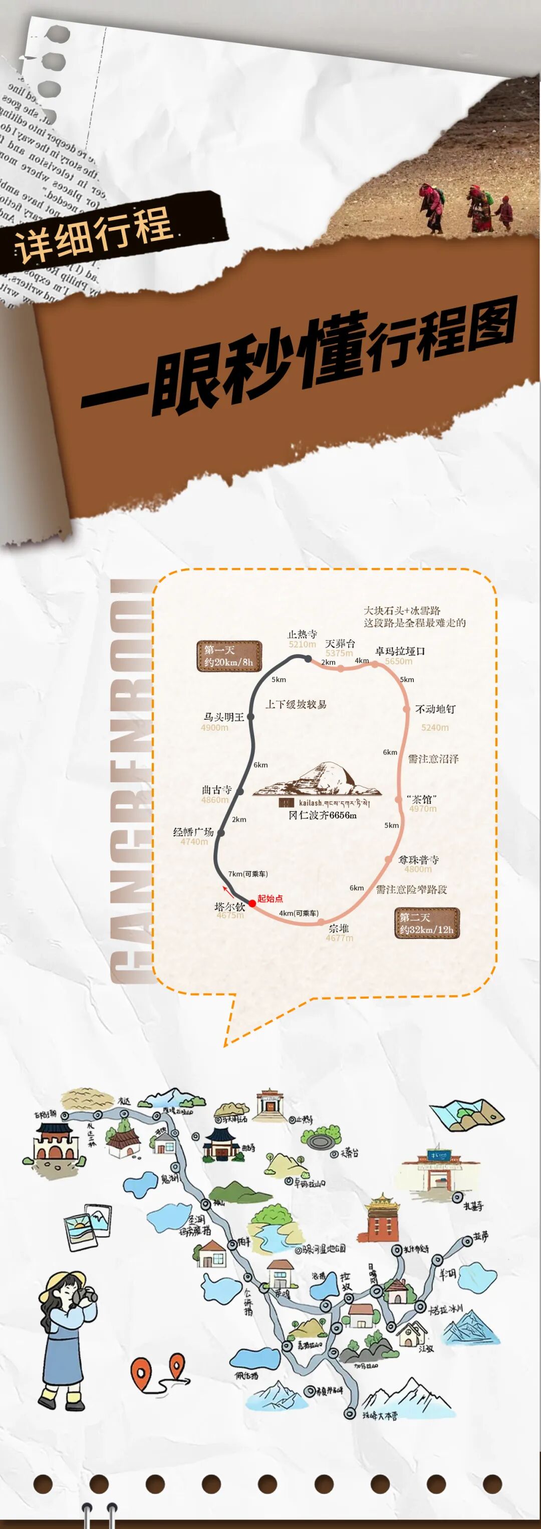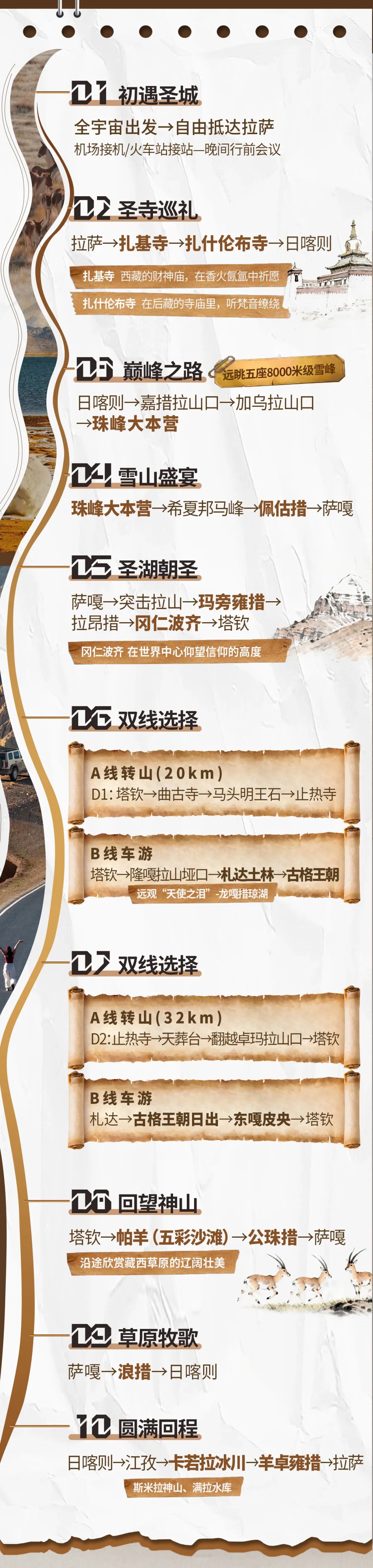 第六天和第七天AB线为两条自选路线,可以自由选择转山行程或是车游行程,选择转山的游客由领队带领转山,选择车游的游客由司机继续带领前往下一站景区游玩,第七天晚上两队回到塔钦汇合
