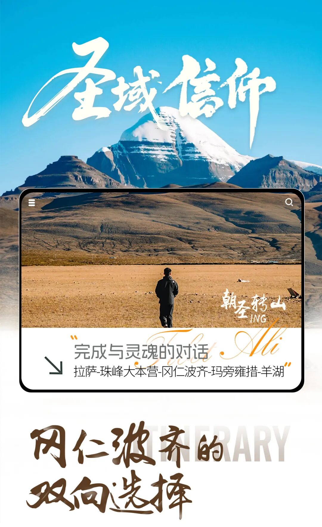 今天是美景应接不暇,终点是那“世界的中心”—冈仁波齐神山。沿着喜马拉雅山脉一路行进,翻过马攸木拉山口(海拔5200米),在距离冈仁波齐东南20km处,我们走近那永恒不败的西天瑶池——玛旁雍错。西藏的三大圣湖之一,信徒们认为,玛旁雍错是佛祖赐给人们的甘露,它能清楚人们肌肤上的污秽,能洗净人心灵上的五毒,更能延年益寿。