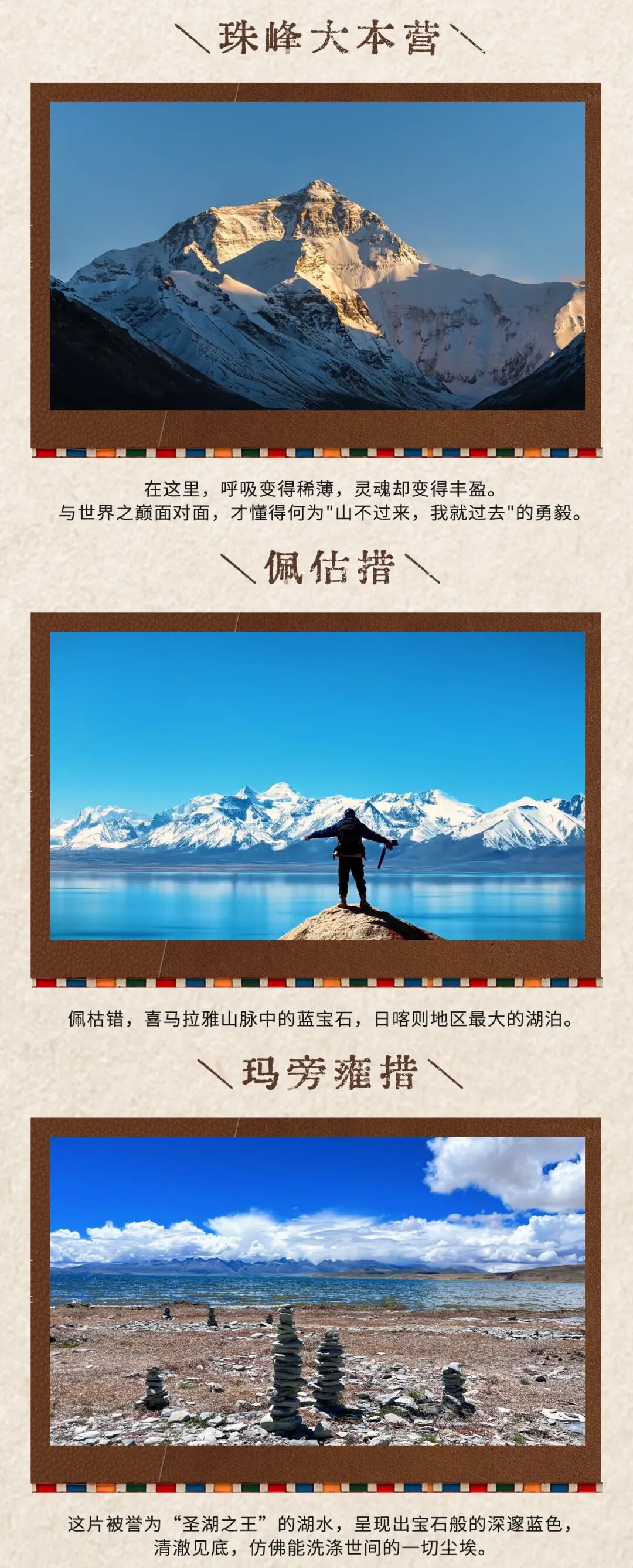 从日喀则出发一路向西前往距离珠穆朗玛峰最近的地方珠峰大本营,前往这座世界第一峰的必经之路就是嘉措拉,因而,嘉措拉山口就是珠峰的门户,这里是珠峰国家级自然保护区的山口,巨大的保护区标牌竖立在公路上,无数的经幡迎风飘扬。嘉措拉山口5248米,水泥标高牌上挂满了五彩经幡。