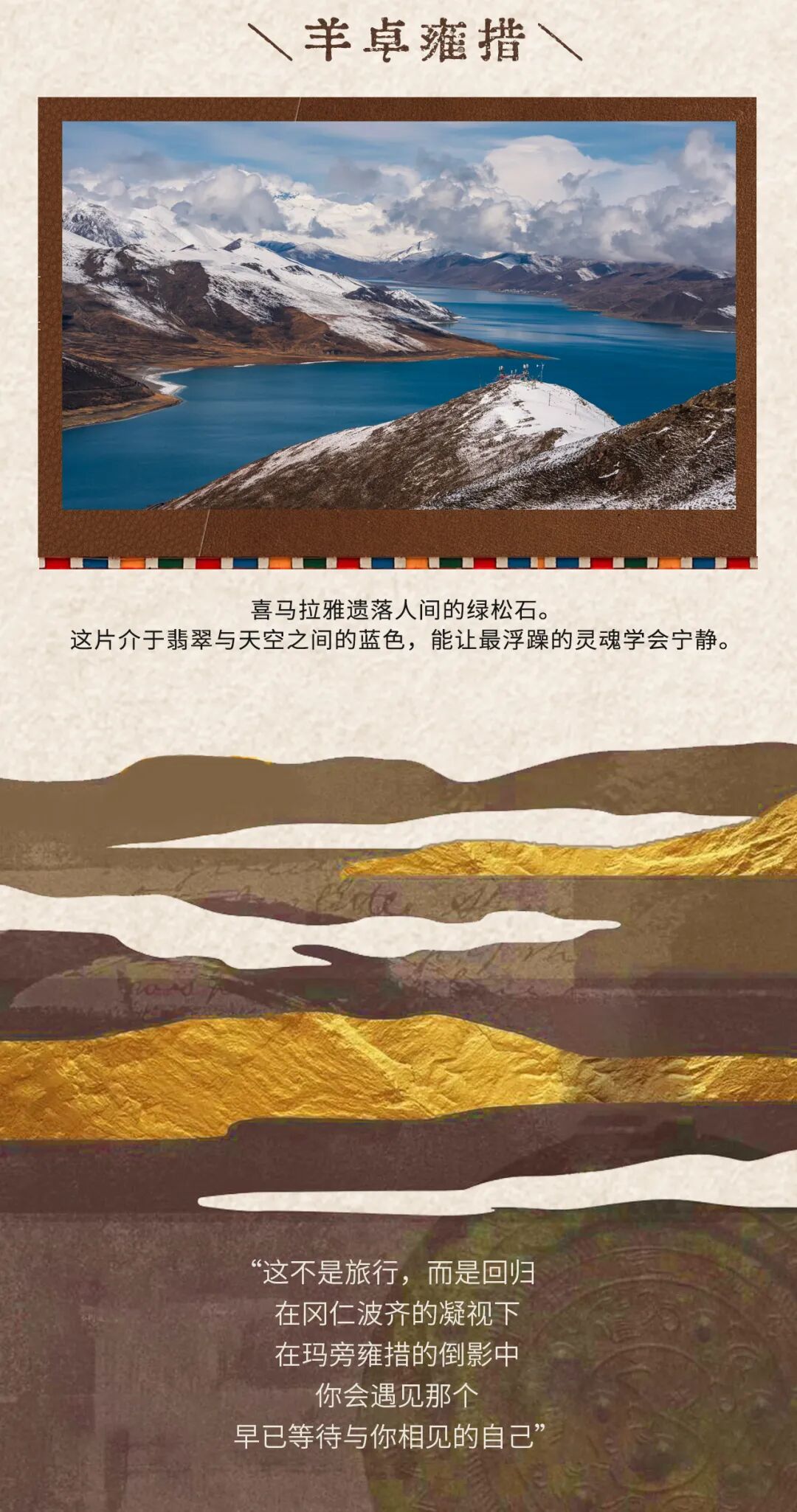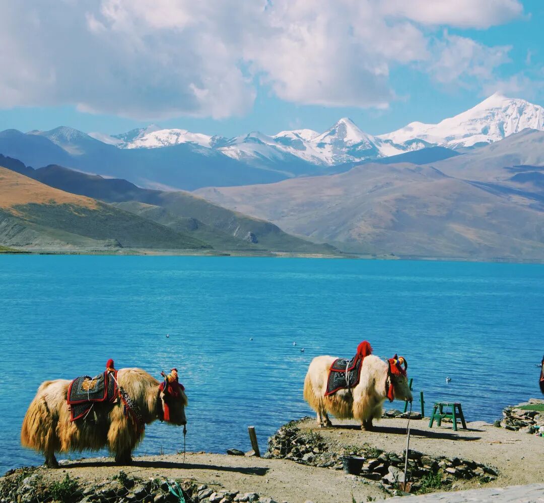 羊卓雍措被誉为世界上最美丽的水。不同时刻阳光的照射,羊湖会显现出不同层次、极其丰富的蓝色,羊卓雍措的水源来自四周念青唐古拉山脉的雪水,没有出水口,雪水的流入与自然的蒸发达到一种奇特的动态平衡,湖水随着光线变幻,演化成千变万化的蓝色。