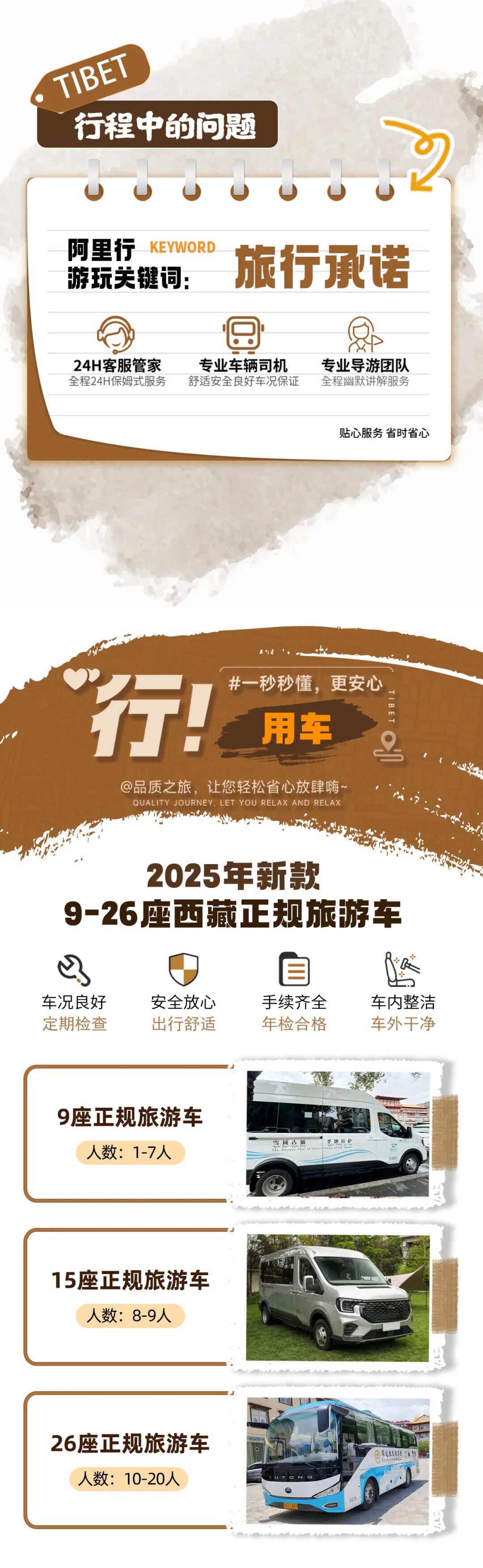 2、【用车】全程正规手续旅行用车的包车费用,同时包含每个座位的保险,全程路桥费,油费,司机食宿补贴。