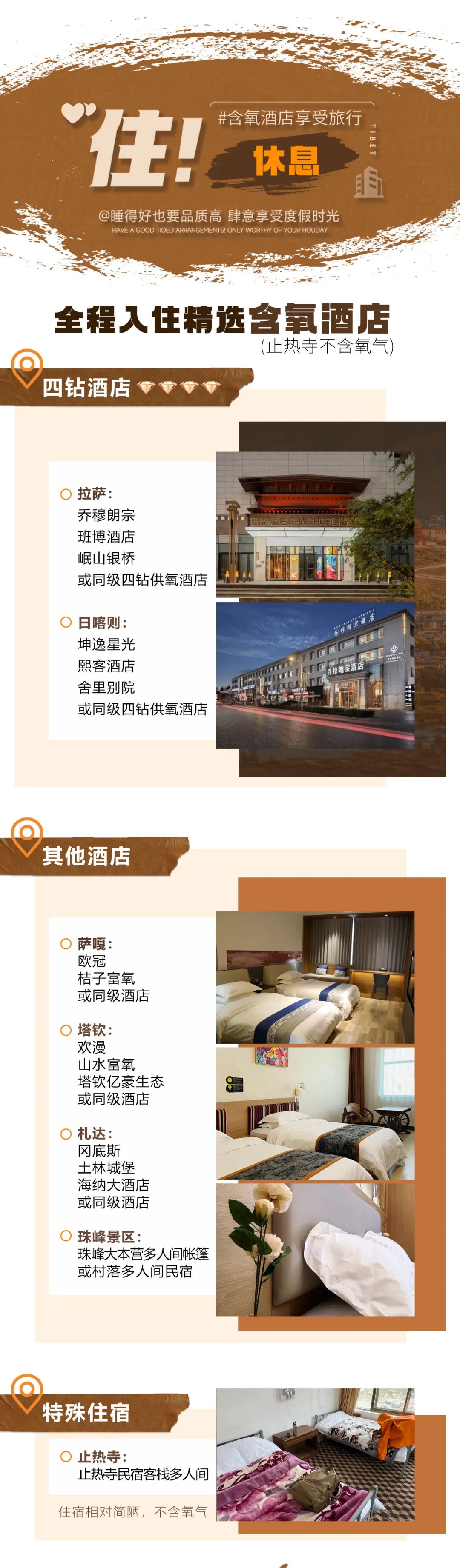 拉萨、日喀则住宿为四星酒店;其他住宿为当地优选;珠峰及转山途中住宿条件很简陋,均为多人间,条件简陋,均无独立卫生间,请各位队友自备睡袋(睡袋以轻便保暖为主,晚上可以在睡袋外加一层被子保暖)。
