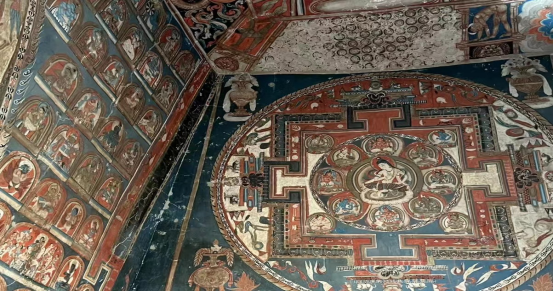 之后出发去东嘎皮央,它就位于这两个村子附近的土石山崖上。遗址分部在东嘎村的部分,是一组石窟群,是中国发现的规模最大的佛教古窟遗址;遗址分布在皮央村的部分,是一处由寺院、城堡、石窟和塔林组成的大型遗址,总规模比东嘎大(若单论石窟规模,则以东嘎村为大),属于古格王朝仁钦桑布时期所建的八大寺之一,建于10世纪,曾一度是古格王国重要的文化中心。石窟壁画是用矿物颜料绘制的,因此色泽完好。