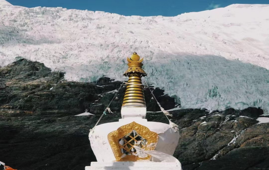 乃钦康桑雪山是西藏四大神山之一,海拨7191米。由于高寒,山体顶部尖锥突兀,常年终日白云缭绕,飘撒粒雪,终年累积、压实,形成了厚达20—100米的冰层,冰层受本身重力影响,缓慢移动发育成了多条冰川。卡若拉冰川就在乃钦康桑雪山下,雪白的冰川如一副巨型唐卡挂在山壁上,在阳光的照耀下熠熠生辉。