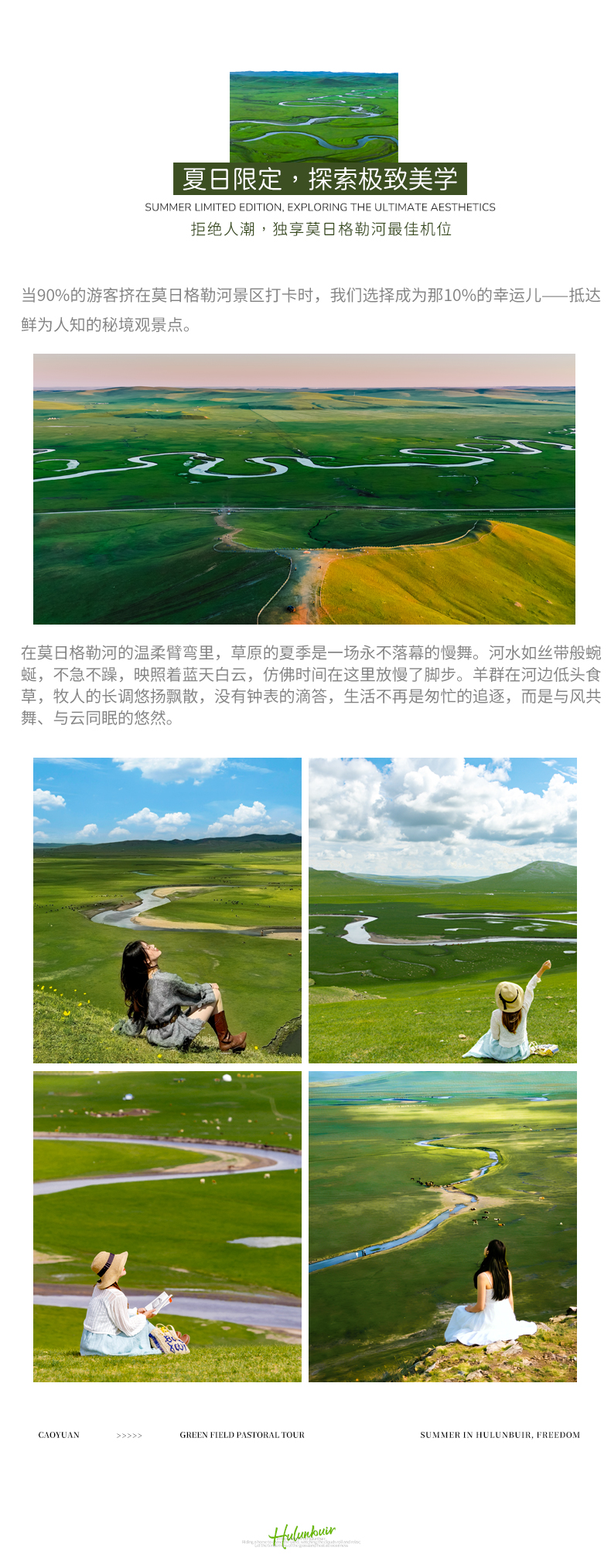 09:00 我们远离市区,继续开始穿越草原腹地,抵达99%的人未曾抵达的小众秘境,避开拥挤的人群,独享上帝视角,俯瞰山下的景观,湿地闪烁着阳光的倒影,鸟儿在湖面上轻轻掠过,河流、湖泊、植被追随自由的风,微微摆动,原来额尔古纳如此浪漫。