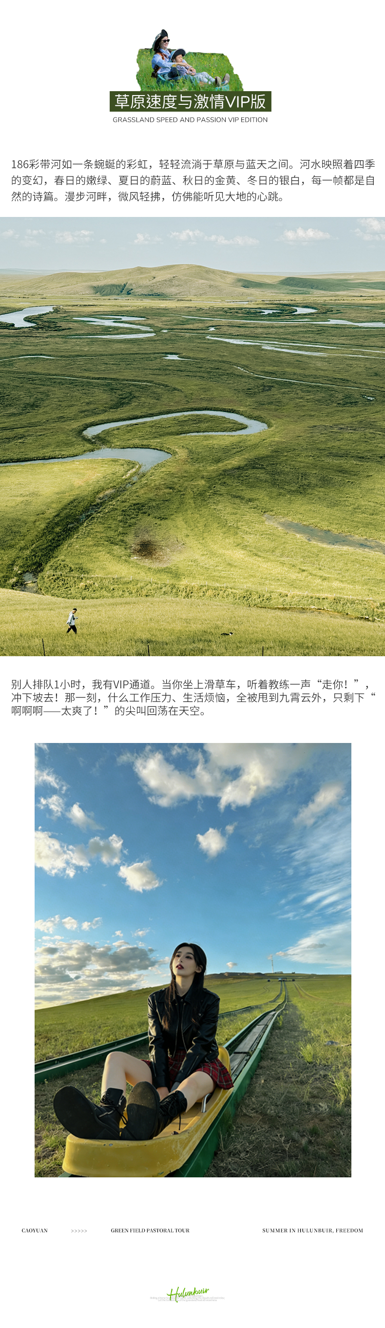 12:30 抵达【186彩带河】,登上山顶以后,眼前的这片边界湿地蔚为壮观,静静流淌的河水在阳光辉映下,呈现一条彩色的绸带横亘在中俄边境上;稍后体验速度与刺激的【滑草】,从山顶一路冲到山下,这种风驰电掣的感觉超爽!一定会让您大呼过瘾!