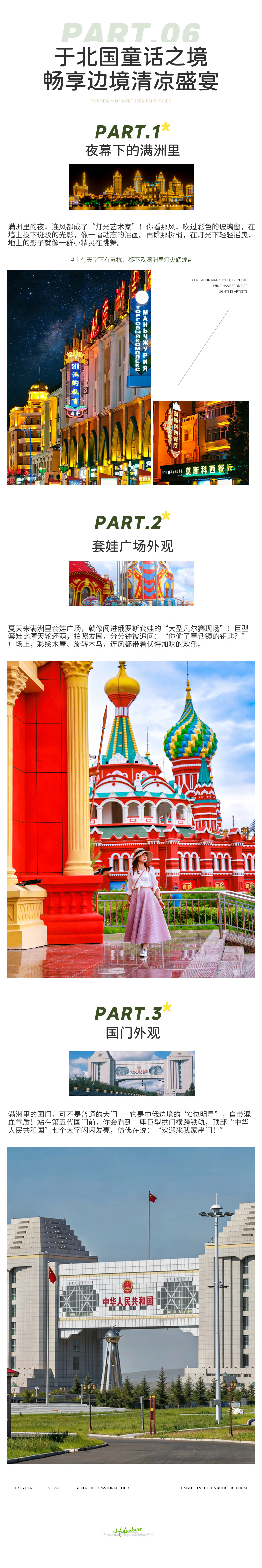 黑山头-牧民之家-186彩带河(网红滑草VIP通道-射箭-高尔夫体验-仿真枪射击)(60KM,车程约1小时)-满洲里(190KM,车程约3小时)-套娃广场外观-国门外观