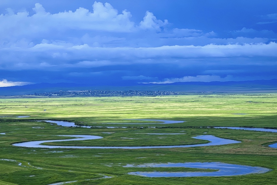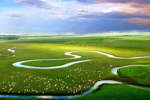 09:30 我们一路向北,沿途欣赏老舍笔下的天下第一曲水【莫日格勒河】,成群的牛羊点点绽放,点缀在青绿色的草原之中,仿佛一幅动人的悠然油画。