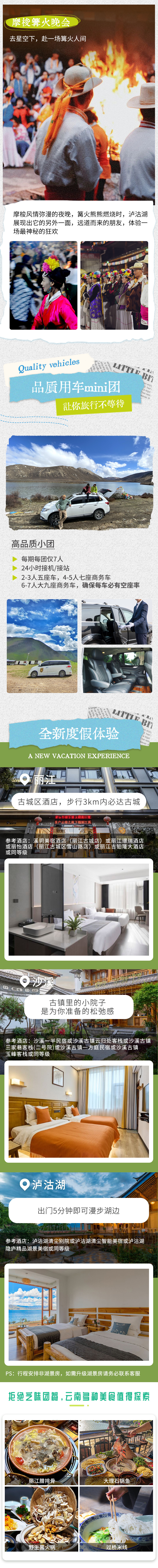 1、住宿:丽江三钻酒店1晚(参考酒店:溪玥美宿酒店(丽江古城店)或丽江璟瑞酒店或丽怡酒店(丽江古城区雪山路店)或丽江吉铂隆大酒店或同等级),泸沽湖三钻酒店/民宿1晚(参考酒店:泸沽湖清尘别院或泸沽湖清尘智能美宿或泸沽湖隐庐精品湖景美宿或同等级),沙溪三钻酒店/民宿1晚(参考酒店:沙溪一半民宿或沙溪古镇云归处客栈或沙溪古镇三家巷客栈(二号院)或沙溪古镇一方庭民宿或沙溪古镇玉峰客栈或同等级);