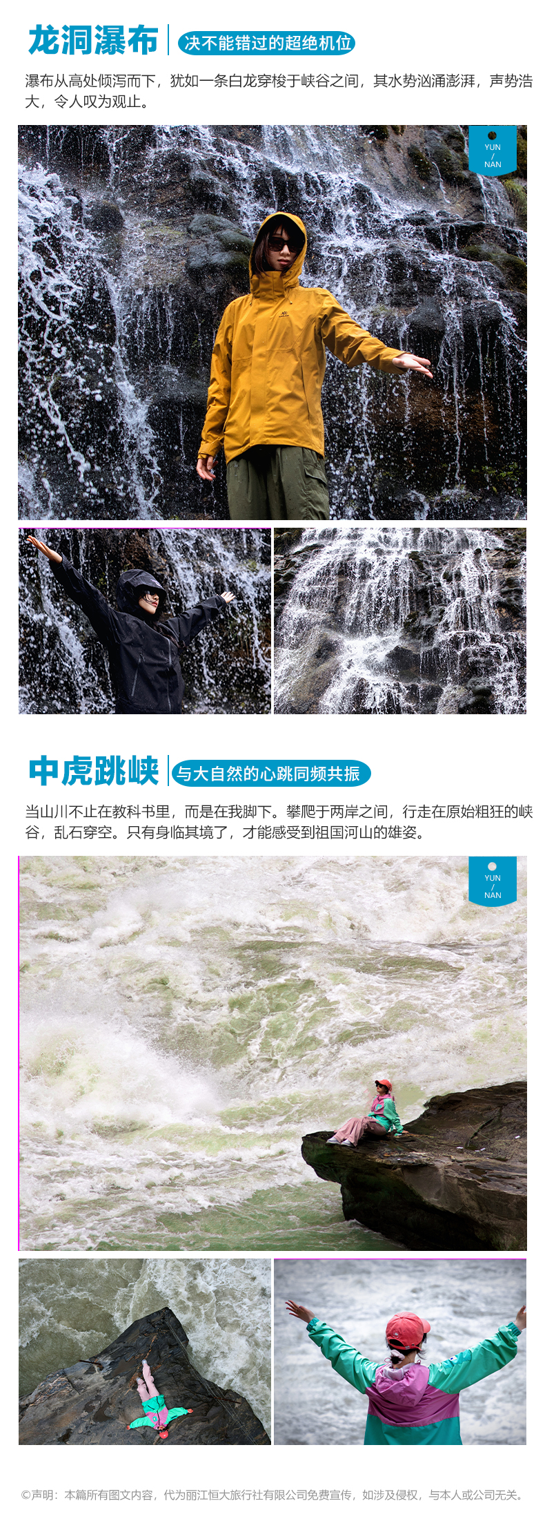 早餐后,我们从香格里拉/丽江出发,约1.5小时抵达虎跳峡镇,随后驱车经过羊肠小道前往虎跳峡高路徒步。领队带领大家热身运动后,开始徒步世界三大峡谷之一【虎跳峡】高路,沿途欣赏玉龙雪山群峰和虎跳峡峡谷风光;体验虎跳峡极致的峡谷风情,徒步约2小时抵达本地湾,打卡传奇美景"halfway"爽死你阳台,留下美好瞬间;沿途边走边欣赏磅礴的峡谷风光,经龙洞瀑布的冲刷洗礼,便也脱胎换骨,还给你心空一隅明静。