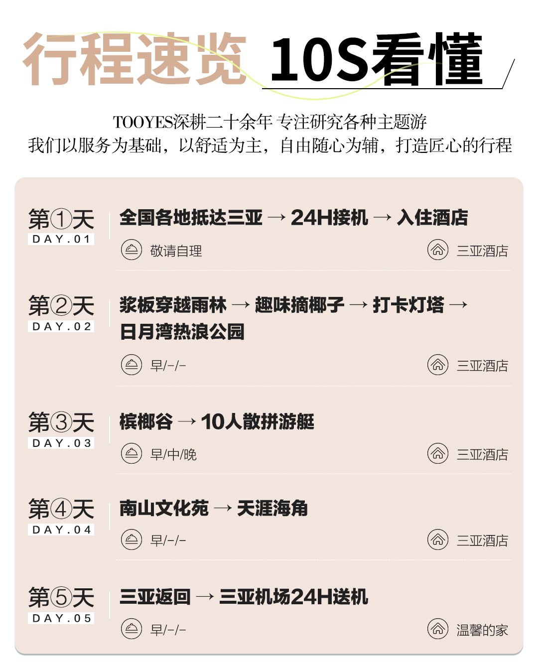 参考航班(以名单预定为准): CZ3836 浦东-三亚 18:20-22:00 CZ6753 三亚-浦东 07:55-11:10 | ||