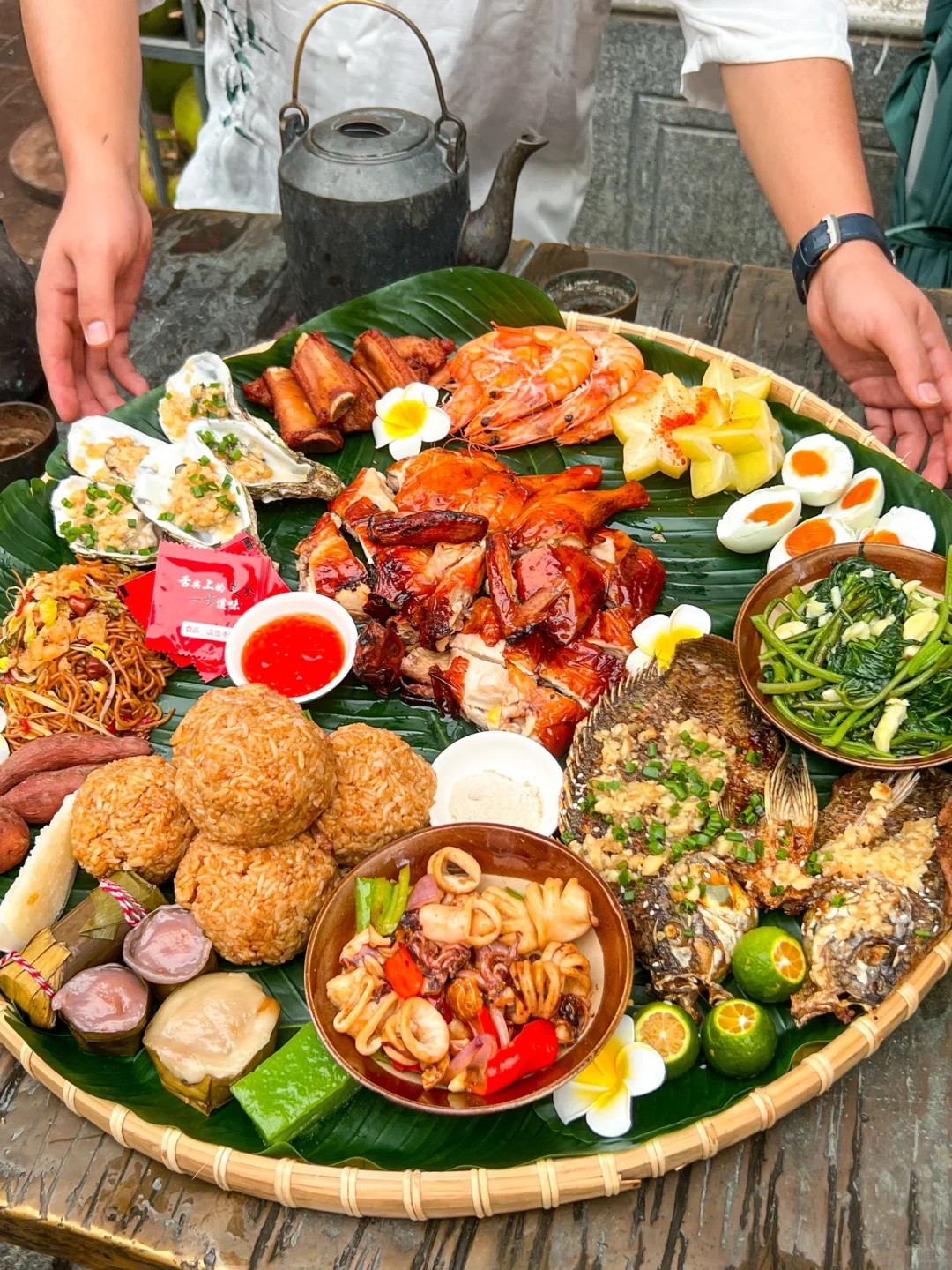 锁黎王家宴隐藏玩法👑 手抓吃饭才是正确打开方式❗ 像本地奥雅(黎族长老)那样把排骨/烤鱼/椰丝卷叠在饭团上,一口咬出三重口感暴击💥~配上山兰米酒对歌局,微醺时跟着黎族阿妹跳竹竿舞,体验感秒杀网红酒吧!