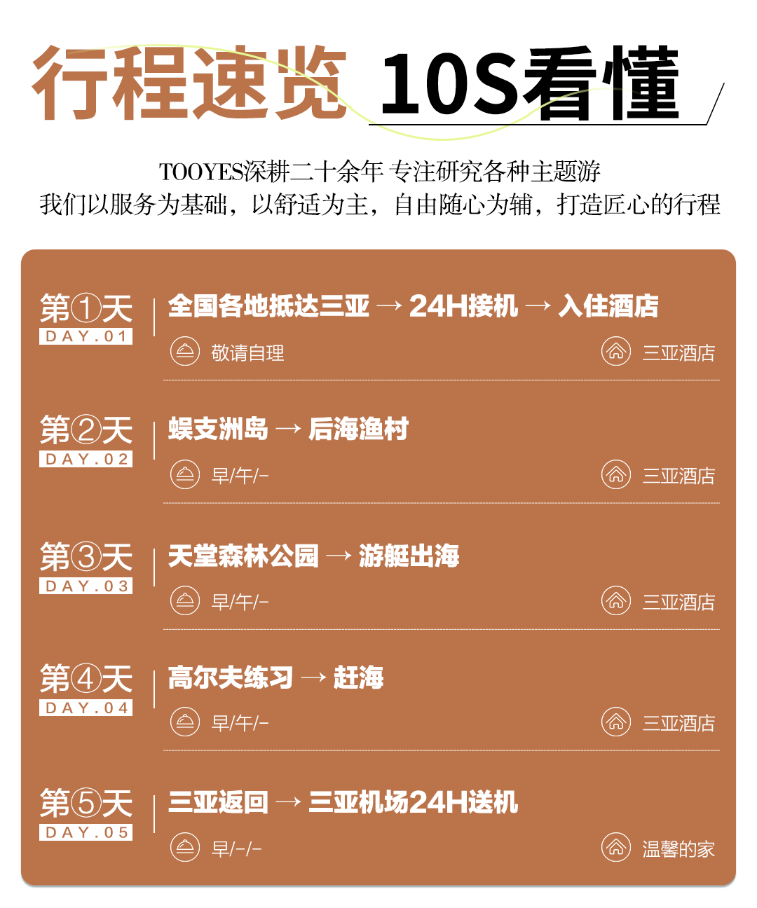 03、特别提示:部分景区由于交通工具的特殊性,故对旅游者的年龄和身体条件有相应的要求。如岛屿类(蜈支洲岛)景区规定70岁以上及行动不便游客(包括孕妇)需填写景区的免责声明方可登船上岛;70周岁以上老年人出于安全考虑,景区不予接待(我社按团队采购成本价格予以退费),敬请知晓。