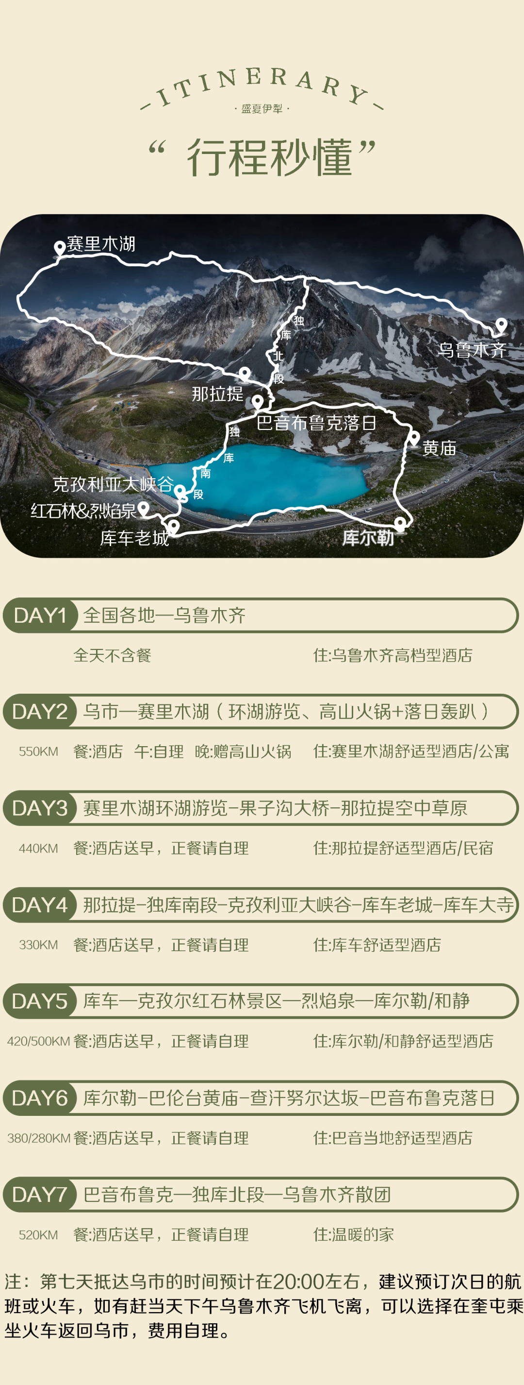 4. 抵达乌市的时间预计在20:00左右,建议预订次日的航班或火车,以免耽误返程;如有赶当天下午乌鲁木齐飞机飞离,时间上比较紧张的团友,可以选择在奎屯乘坐火车返回乌市,后前往乌市国际机场,火车票及交通费用请自理。