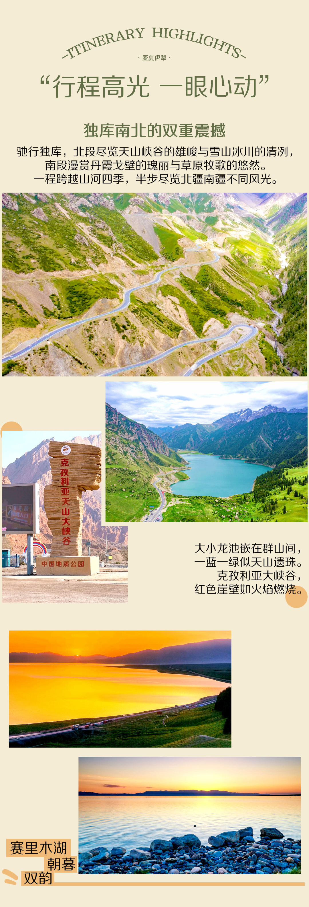 1. 独库公路沿途景色绝美,山路蜿蜒曲折,乘车请系好安全带,下车拍照时请注意来往车辆,确保安全。