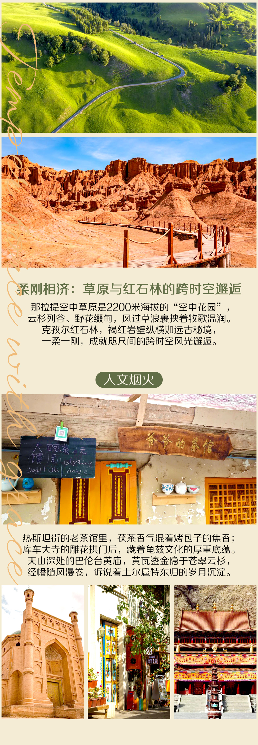 今日早餐后出发,驶入独库公路南段,这段公路以“峡谷湖泊”为特色,行驶中可欣赏到从草原渐变到峡谷的景观。中途抵达大小龙池,小龙池小巧玲珑,湖水碧绿如翡翠;大龙池辽阔壮观,湛蓝湖水映着雪山。后抵达克孜利亚大峡谷,深入峡谷,红色崖壁在阳光照射下如火焰燃烧,峡谷内沟壑纵横,岩壁纹理独特,深入其间感受大自然的鬼斧神工。后前往库车老城,抵达后先前往库车大寺,参观雕花拱门、礼拜堂,感受伊斯兰建筑的独特魅力。后逛一逛热斯坦街,这条百年老街藏着库车的烟火气,逛手工乐器店、百年馕店,尝刚出炉的库车大馕,还有藏在老城的彩色密码——花帽巷+门巴扎,每一步都是新疆风情。结束后前往酒店入住。