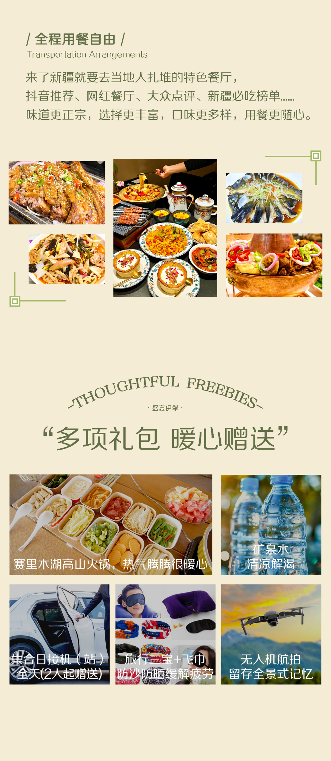 6.全程用餐不含,就是为了让大家有更多的机会去品尝当地美食,市区晚上建议大家三五结伴而行用餐,中午根据情况由领队推荐集体团餐或者路餐,常规午餐人均消费约30-40元左右,晚餐人均消费约40-50元左右,部分景区/住宿地因食材运输等原因,餐食消费较常规人均消费高10-20元左右(景区内建议大家集体吃团餐,经济划算)。