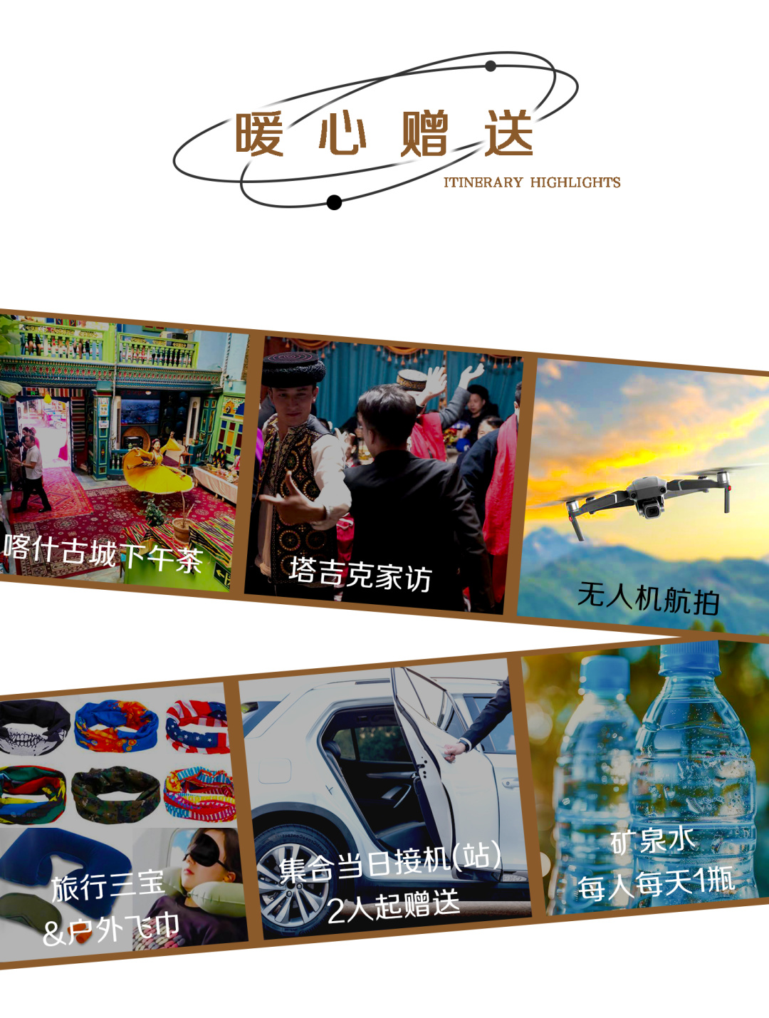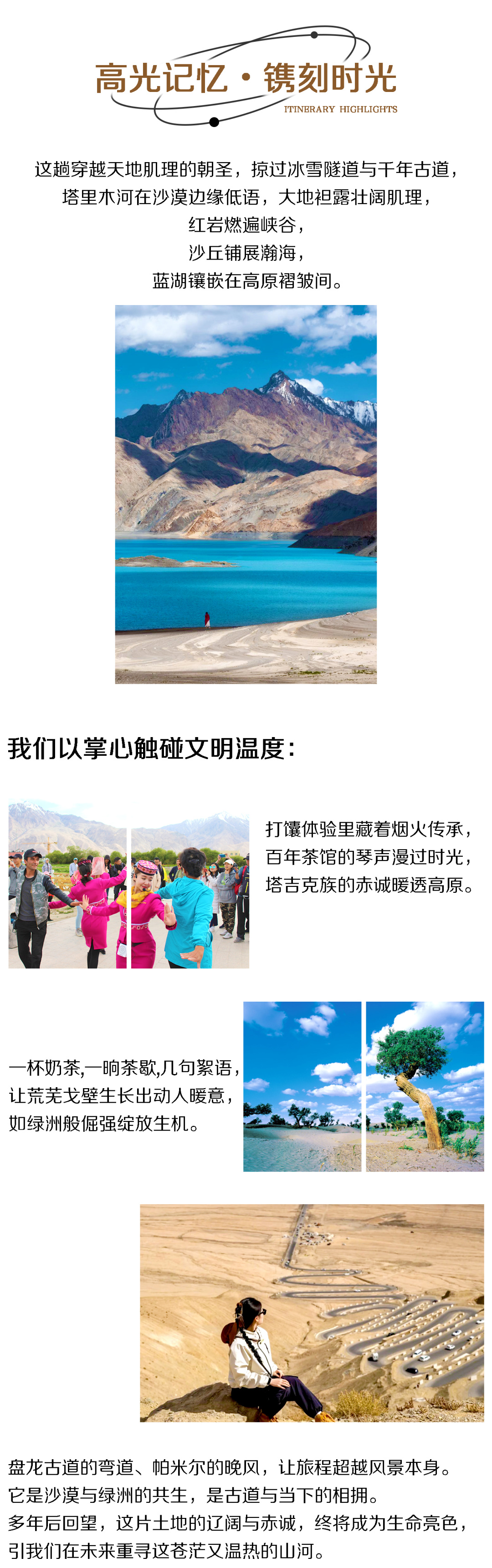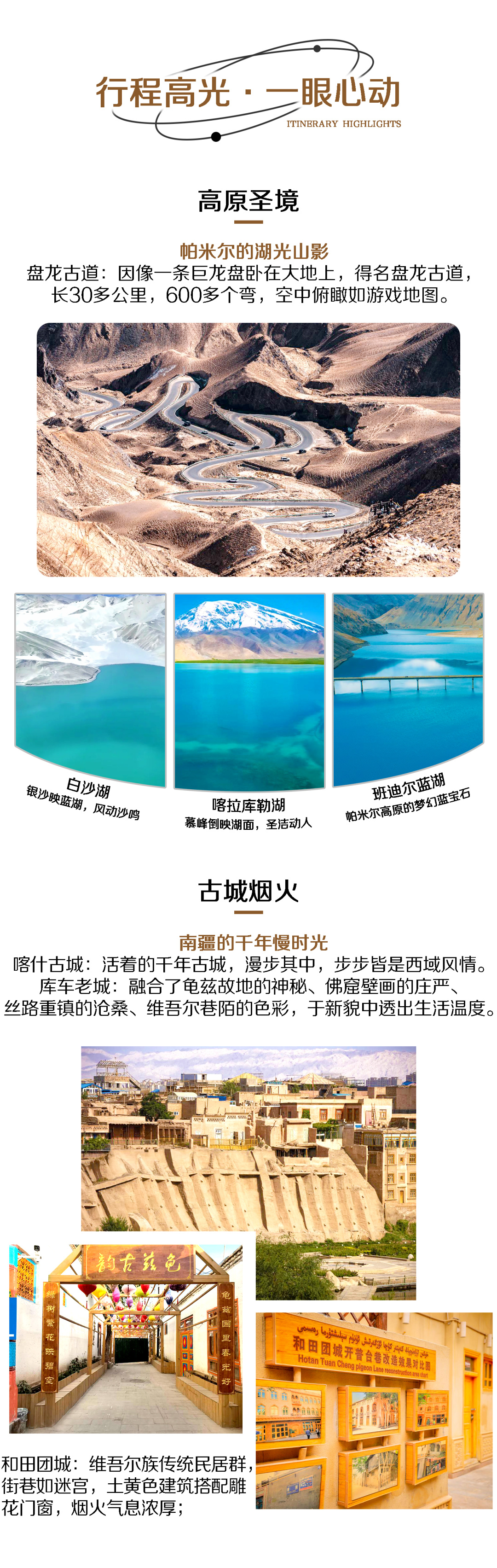 3. 门票:白沙湖、喀拉库勒湖因沿途就可以看到,司机会给大家时间拍照,如需进入景区,请自行购买门票;喀什古城、瓦罕走廊、盘龙古道、班迪尔蓝湖、塔合曼湿地暂未收取门票费用,如产生费用请各位队员自理。