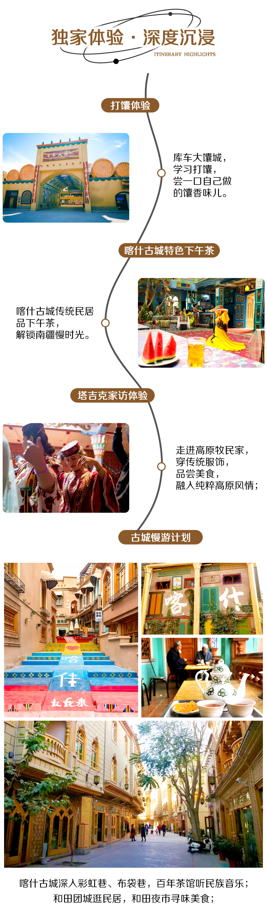 今日出发前往喀什,喀什古城有着悠久的历史,距今已有2000余年,它如同一本沉甸甸的古老书籍,厚重而充满故事。不同于国内大多数古城的徽派建筑,它保留了自己独特的异域风情,将历史与现代、东方与西方完美的融合。古城里老人蹒跚的脚步,孩童踢球的身影,姑娘嬉笑的面庞...都是古城的日常,仿佛时间在这里慢了下来。去艾提尕尔广场晒晒太阳,这里有着新疆最大的清真寺(如进入门票自理);可以去彩虹巷,布袋巷打个卡,幽深的窄巷,记录了千年的过眼云烟;去百年茶馆品品茶,飘扬的茶香,错落的琴声浓缩了喀什好几代人的美好记忆;逛累了去享用今日下午茶,后前往酒店入住。