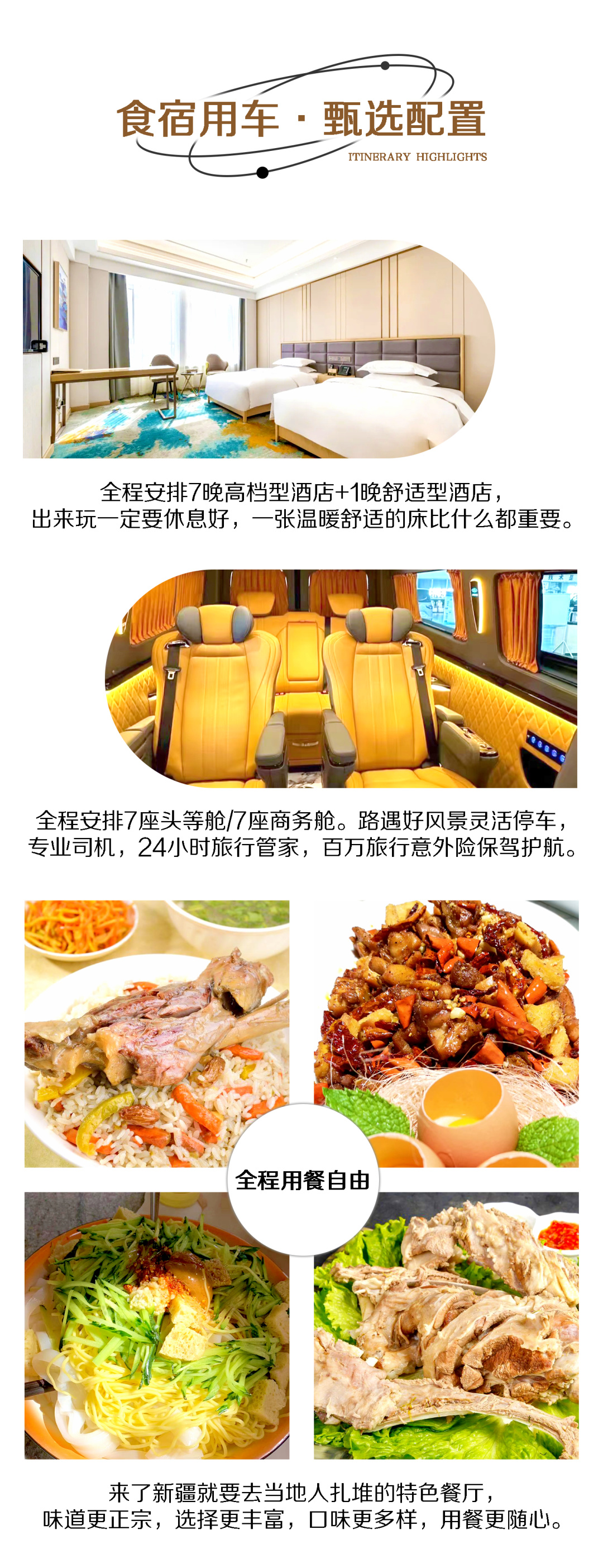 3. 赠送集合日当天免费接机/接站服务(2人起赠送,提前抵达者请自行前往酒店)。请提前至少3天告知航班/车次信息,如未告知,视为自动放弃。默认安排拼车(1小时内),如您不想等待,可自行打车或搭乘地铁前往酒店(费用自理)。抵达乌鲁木齐机场/火车站后,请主动联系接机人员确认上车位置,如出现等候的情况,请给予谅解。不含送机及送站服务,送机(站)服务:5座车100元/辆、7座车200元/辆,如需要请提前至少1天告知工作人员。