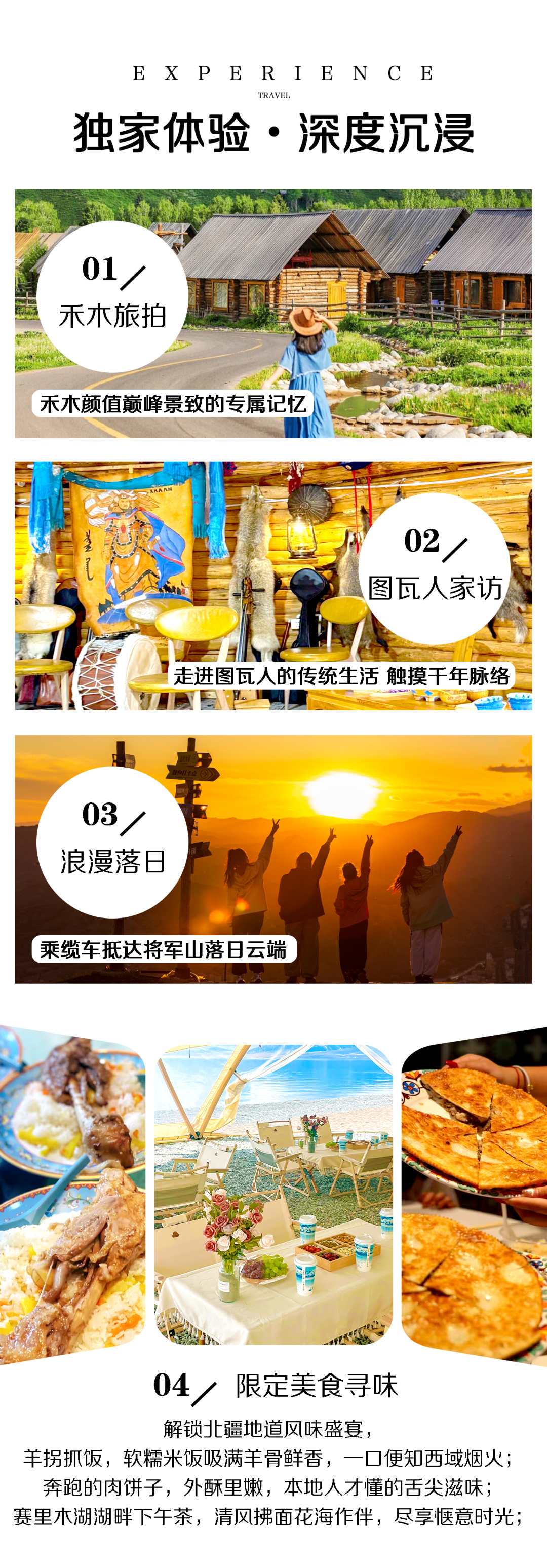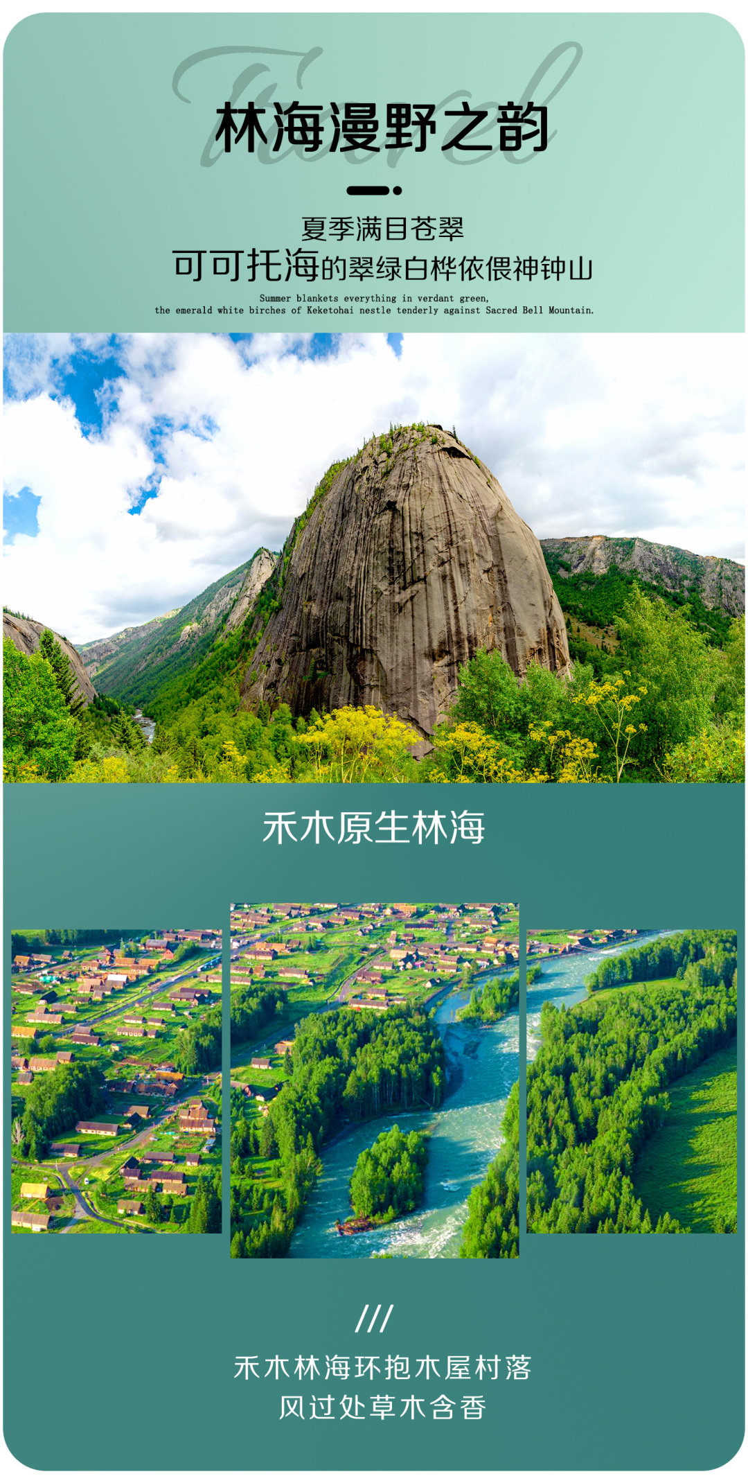 今日早起前往可可托海国家地质公园,这里的矿石资源丰富,稀有金属矿藏在全国名列前茅,曾替国家偿还了前苏联1/3的债务,在地质界熠熠生辉,是名副其实的英雄矿。额尔齐斯河从这里流淌,滋润完北疆这片沃土后去往西西伯利亚,最后汇入北冰洋。团友可换乘区间车前往神钟山,沿途的山涧溪流,松柏桦树,让你目不暇接,仰望神钟山,山体表面无植被也无泥土,竖道的沟壑犹如凝固的瀑布,神奇极了。后沿G331 边境公路向阿勒泰行驶,沿途雪山、草原、戈壁交替出现,远眺哈萨克斯坦边境风光,感受 “一步一景” 的边境风情。抵达阿勒泰后前往将军山,坐着缆车上山,随着海拔升高,城市灯光像打翻的星河在脚下铺开,当夕阳跌进阿尔泰山的怀抱,粉橘色天际线将山峦晕染成流动的金色油画,听着耳边动感的音乐,人世间的浪漫莫过于此。后前往酒店入住。