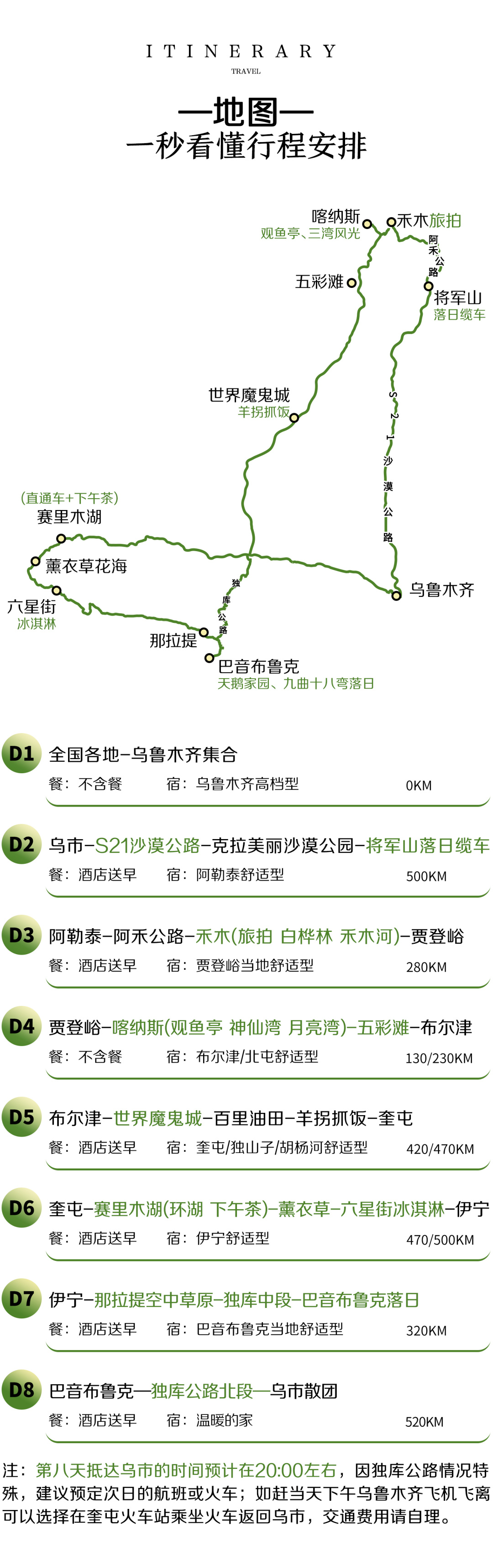 3. 抵达乌市的时间预计在20:00左右,建议预订次日的航班或火车,以免耽误返程;如果赶当天晚上乌鲁木齐飞机飞离的团友,可以选择在奎屯火车站乘坐火车返回乌市,后前往乌市国际机场,火车票及交通费用请自理。