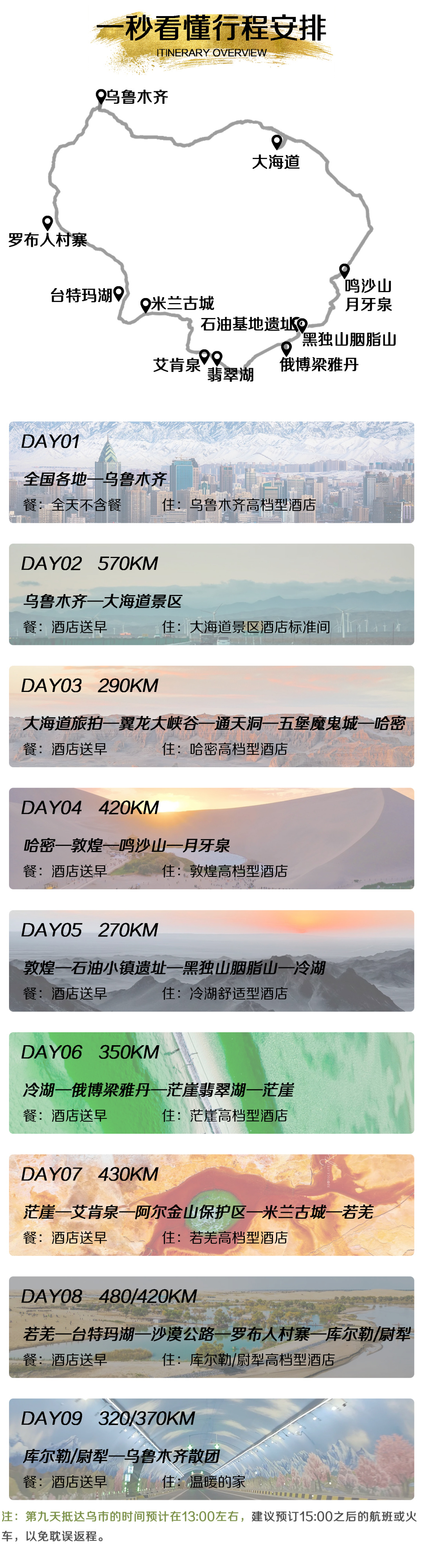 2. 抵达乌市的时间预计在13:00左右,计划今天返程的团友,建议预订15:00之后的航班或火车,以免耽误返程;