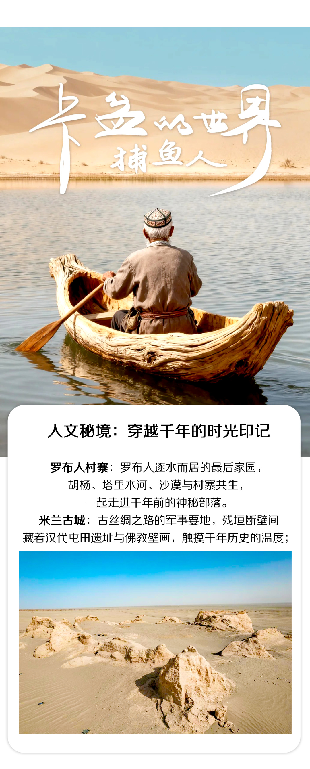 今日早起出发前往罗布人村寨,途经台特玛湖,作为塔里木河的尾闾湖,湖水清澈、芦苇丛生,水鸟在湖面嬉戏,与周边沙漠形成强烈反差,是摄影打卡的绝佳地。随后驶入沙漠公路,穿越塔克拉玛干沙漠边缘,无边沙海延绵天际,公路如丝带铺向远方,可随时停驻拍摄沙漠风光,感受 “大漠孤烟直” 的壮阔。中后抵达罗布人村寨景区,这里是罗布人逐水而居的最后家园,胡杨、塔里木河、沙漠与村寨共生。可体验罗布人传统捕鱼技艺,与当地老人闲聊,感受古老民族的生活智慧。后前往酒店入住。