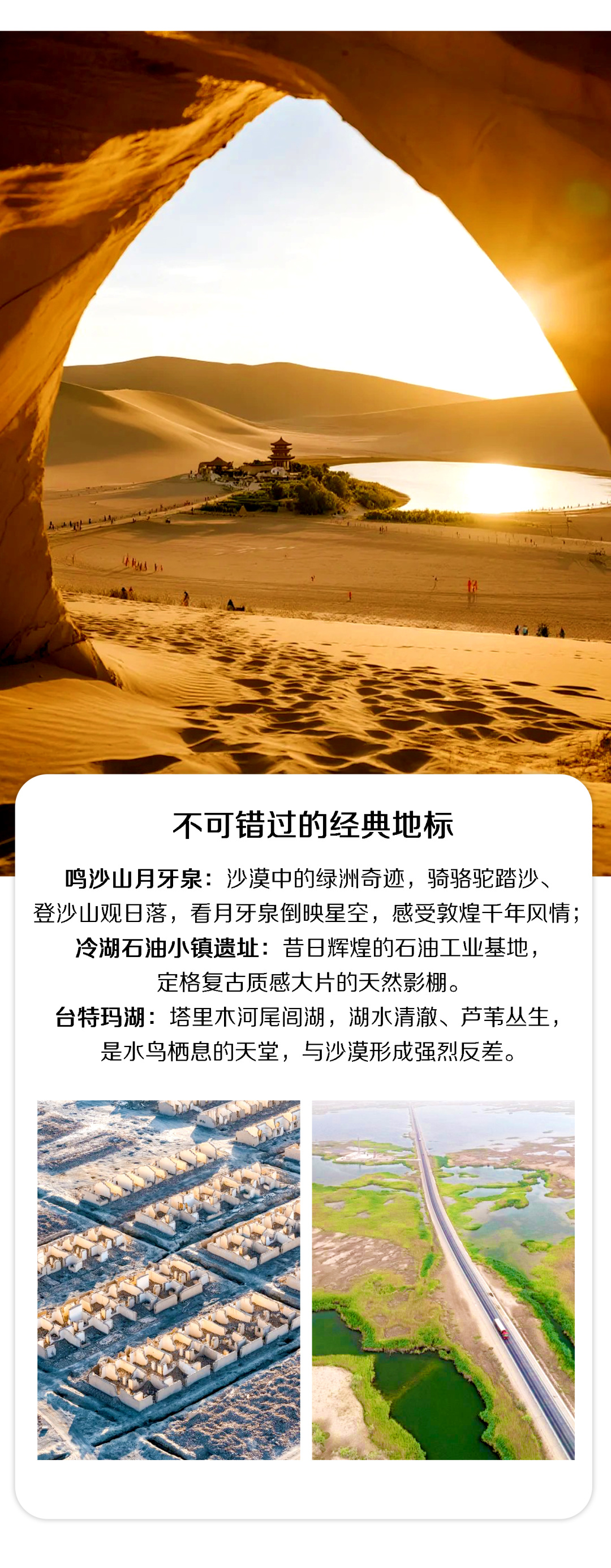 今天早起离开哈密前往敦煌,抵达后直奔鸣沙山月牙泉,这里是沙漠中的绿洲奇迹,沙丘连绵起伏,月牙泉静卧其间,形如弯月。可选择骑骆驼踏沙(费用自理),或徒步登沙山,感受沙子滑落的细腻触感。傍晚占据最佳位置守候日落,夕阳将沙山染成金红,月牙泉倒映着天空与沙丘,绝美如画。夜幕降临时,若天气晴朗,还可欣赏月牙泉星空倒影,浪漫至极。后前往酒店入住。