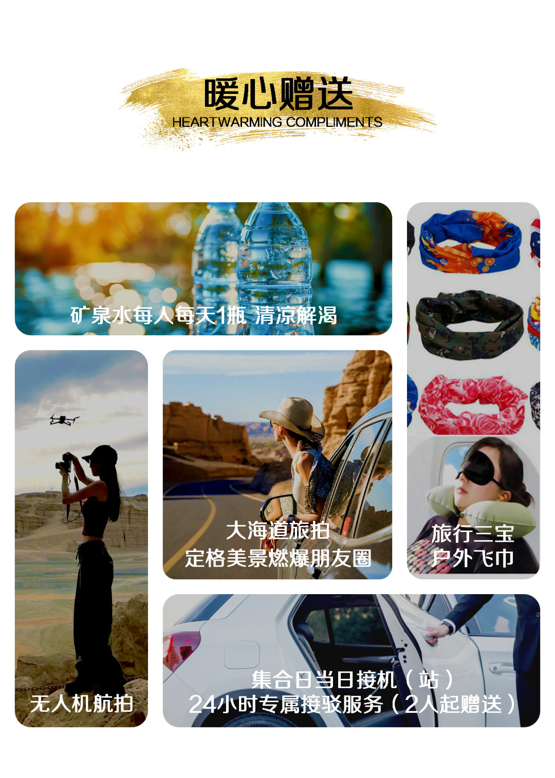 3. 赠送集合日当天免费接机/接站服务(2人起赠送,提前抵达者请自行前往酒店)。请提前至少3天告知航班/车次信息,如未告知,视为自动放弃。默认安排拼车(1小时内),如您不想等待,可自行打车或搭乘地铁前往酒店(费用自理)。抵达乌鲁木齐机场/火车站后,请主动联系接机人员确认上车位置,如出现等候的情况,请给予谅解。不含送机及送站服务,送机(站)服务:5座车100元/辆、7座车200元/辆,如需要请提前至少1天告知工作人员。