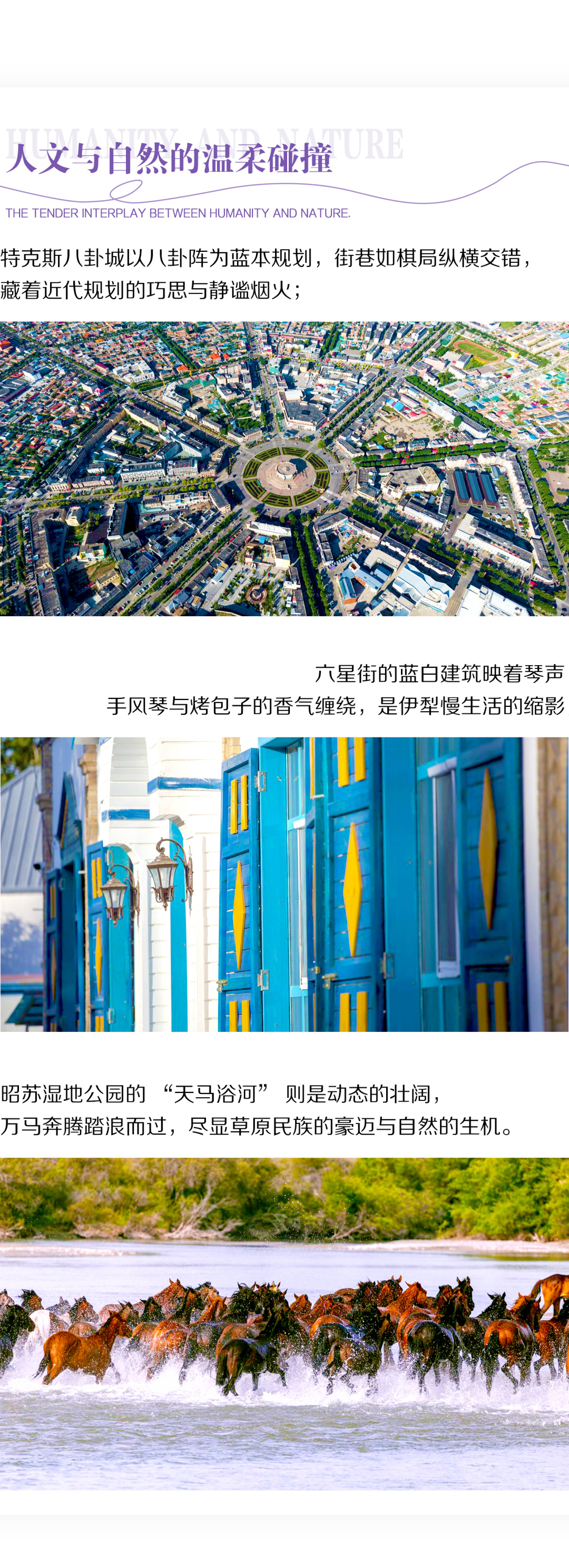 今日游览夏塔景区,乘区间车进入夏塔,夏塔是森林与冰川的绝美邂逅,是一个充满神秘色彩的地方。蓝天、冰峰、雪山、松林、河流、灌木和草原交织在一起,形成了一幅壮丽的画卷。【想要近距离观赏木扎特冰川的队友可以选择徒步/骑马前往鲜花台(单程约4KM,电瓶车或骑马,费用自理,骑马时请选择正规马队)】适时前往昭苏湿地公园,湿地在阳光的加持下,仿佛贴着金箔,发出耀眼的光。如运气好会欣赏到“天马浴河”的表演,天马踏浪飞奔,场面极为壮观。而后登上观景平台,俯瞰湿地公园和昭苏的全貌。后前往全国唯一一座没有红绿灯的城市——特克斯八卦城。站在太极广场中心往外看,整座城市就像一幅巨大的八卦图徐徐展开。后前往酒店入住。