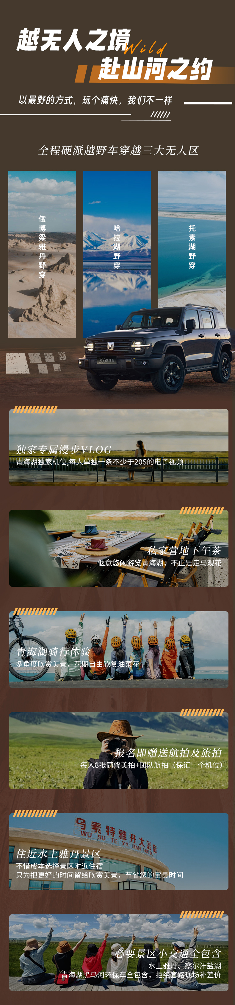 3、所有团期报名即赠送航拍+旅拍(一共保证两个机位,拼团团期和私家团团期都包含,如团期旅拍无法安排则改为航拍,即一共赠送两个机位的团队航拍)