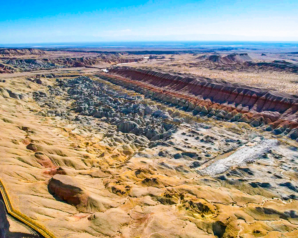 10 : 30首先我们抵达【都兰星落谷】,这里是新晋的小众打卡点;也是野生彩虹丹霞的最新发现地;区别于甘肃的七彩丹霞、水墨丹霞等地,这里的丹霞地貌颜色层次更加丰富,由冷色调到暖色调天然过渡,勾勒出一幅宛若水墨画的美妙画面。同时这里也是飞驰人生3的取景地之一哦~
