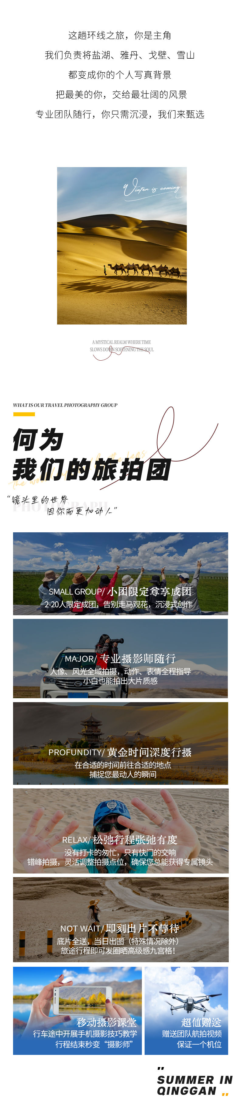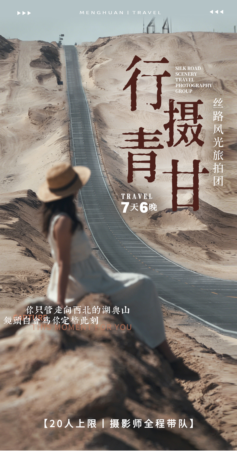 摄影师:当期满7人安排1名摄影师全程单反摄影,不足人数为司机兼摄影师(出行前两天发出行短信,景区内司机无法陪同游玩),为保证每位客人的照片张数及质量,摄影师会进景区进行拍摄(除莫高窟),以每个人都出片为目的,但是并非专业导游不提供讲解及全程陪玩服务,望悉知。