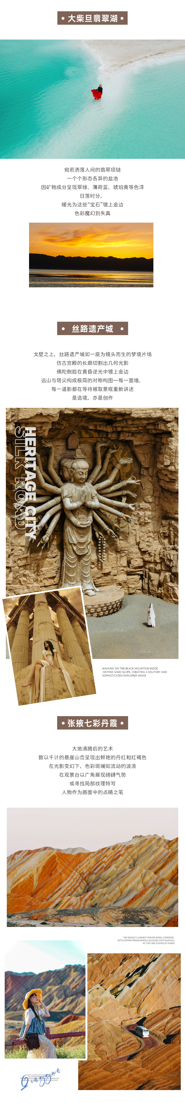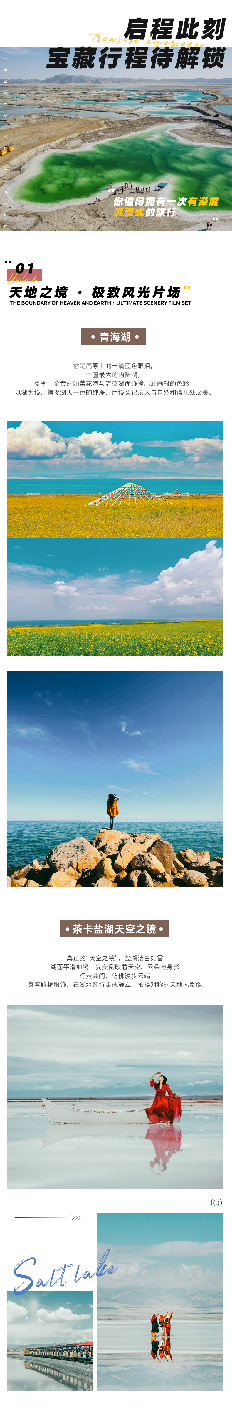 18 : 30抵达【大柴旦翡翠湖】,这里之前是少有人知的天空秘境,晶莹剔透的湖水由于富含各种元素,无数盐池呈现出薄荷绿、蒂芙尼蓝与琥珀黄,日落时分,熔金般的霞光漫染天际,又在剔透的湖面投下温暖倒影。人物立于池畔,轮廓被柔光勾勒,每一帧都仿佛收藏了日落最温柔的碎片。